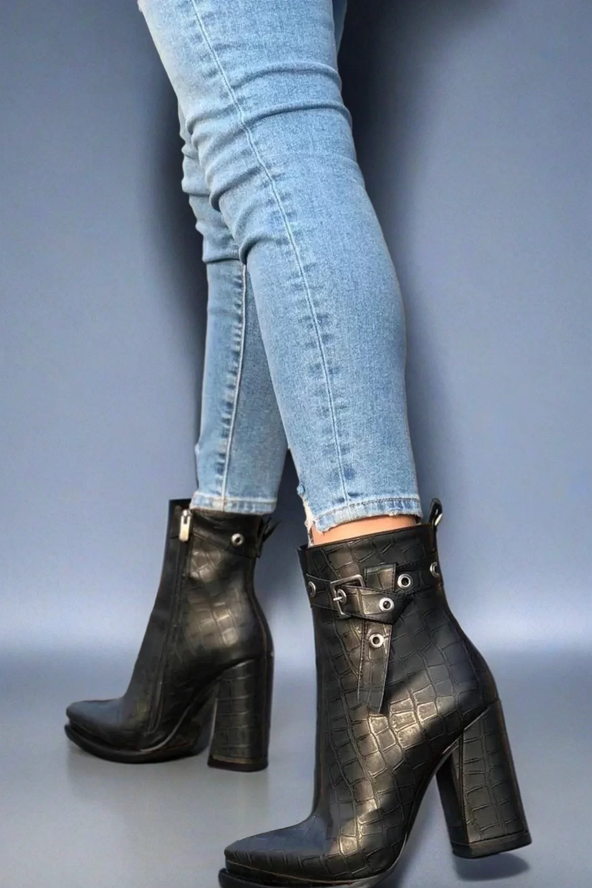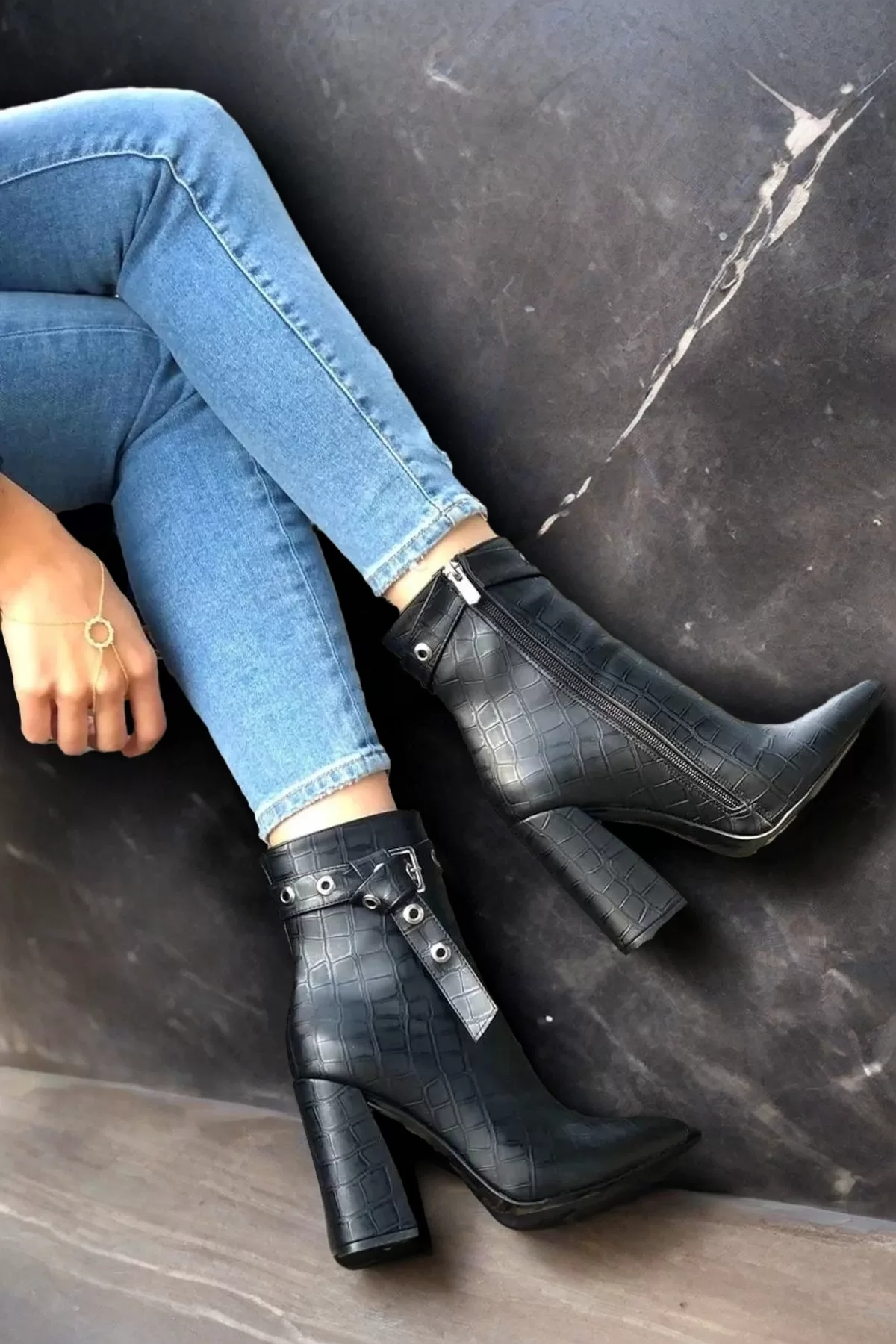 Kroko dokusuyla klasik bot formuna sofistike bir hava katan bu model, kalın topuğu ve sade çizgileriyle dikkat çeker. Fermuarlı yapısı sayesinde kolayca giyip çıkarabilir, petli yumuşak iç taban sayesinde her adımda konforun tadını çıkarabilirsiniz. Kapsül gardırobunuza modern ve güçlü bir dokunuş katmak istiyorsanız bu bot tam aradığınız parça.