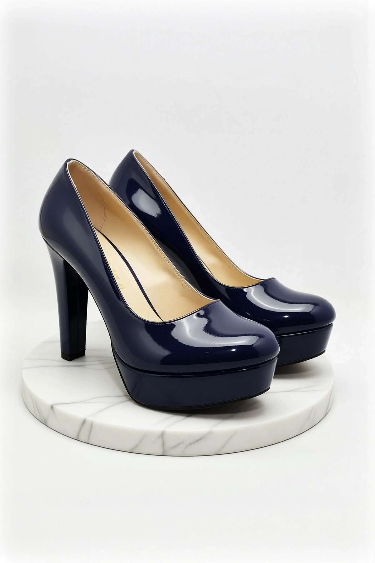 Klasik ve şık tasarımıyla her kıyafetle uyum sağlayan lacivert renkli topuklu ayakkabı, düz deseniyle sade ve zarif bir görünüm sunar.