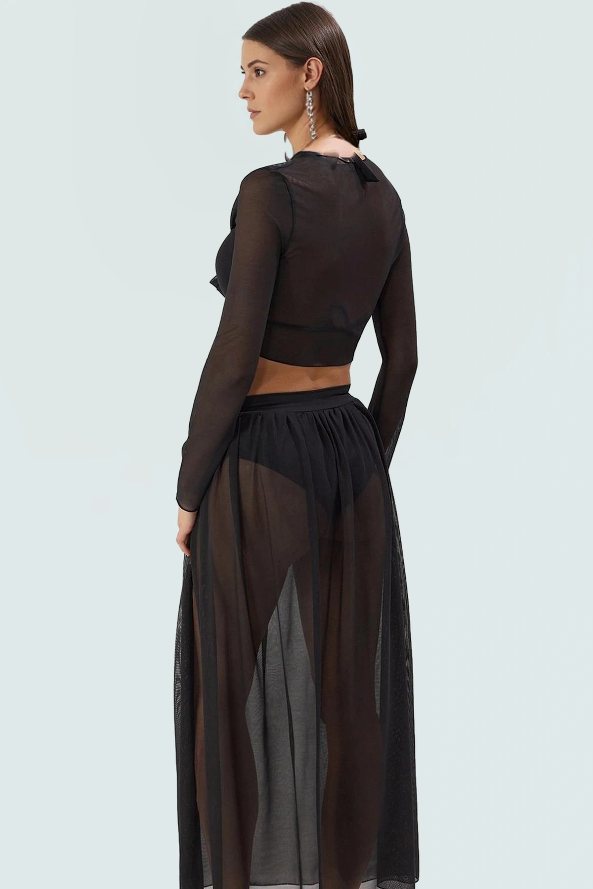 Bu yazın en şık plaj görünümünü yakalamak için mükemmel bir seçenek olan siyah mesh plaj takımımız ile tanışın! 97% polyester, 3% elastan karışımı örme kumaşı, hem rahat hem de nefes alabilir bir deneyim sunuyor. Uzun ve şık eteği, önündeki yırtmaç detayı ile bacaklarınızı olduğundan daha uzun gösterirken, reglan kollu bluzu ile de gün boyu özgürce hareket etmenizi sağlar. Düz ve şık tasarımı ile her vücut tipine uyum sağlar. Bluz üzerindeki bağcık detayı ise takımınıza modern bir hava katıyor.