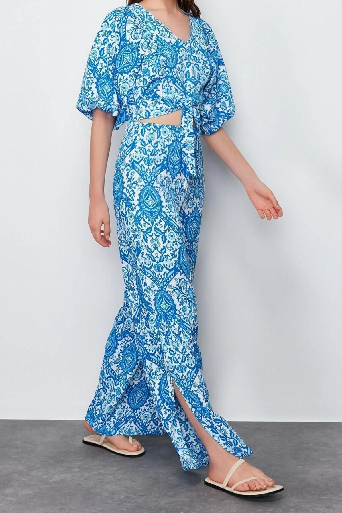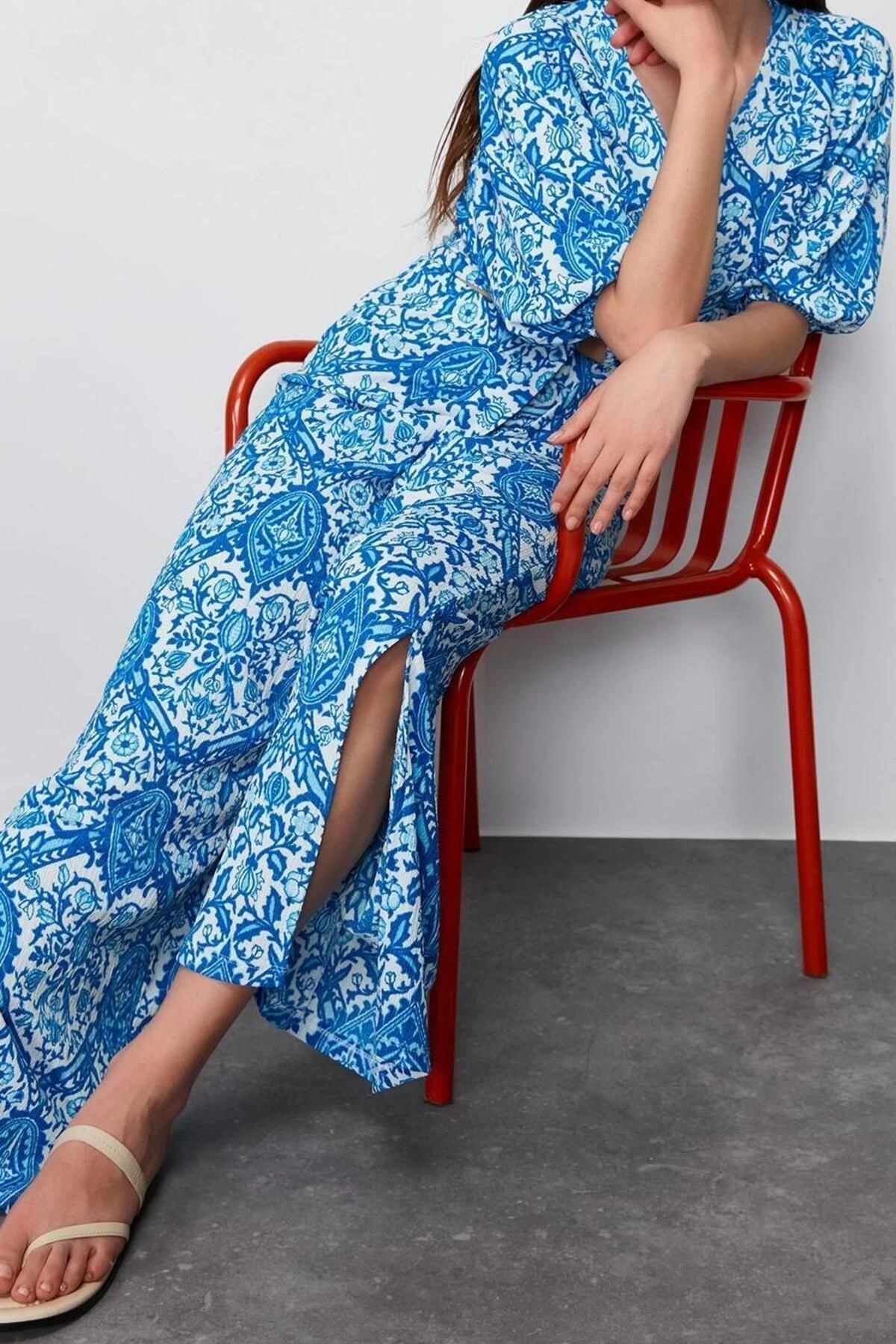 Moda Balon Kol Baskılı V Yaka Balon Kol Relaxed Rahat Kesim Dokulu Esnek Örme Alt-Üst Takım ürünümüz, hem şıklığı hem de rahatlığı bir arada sunar.