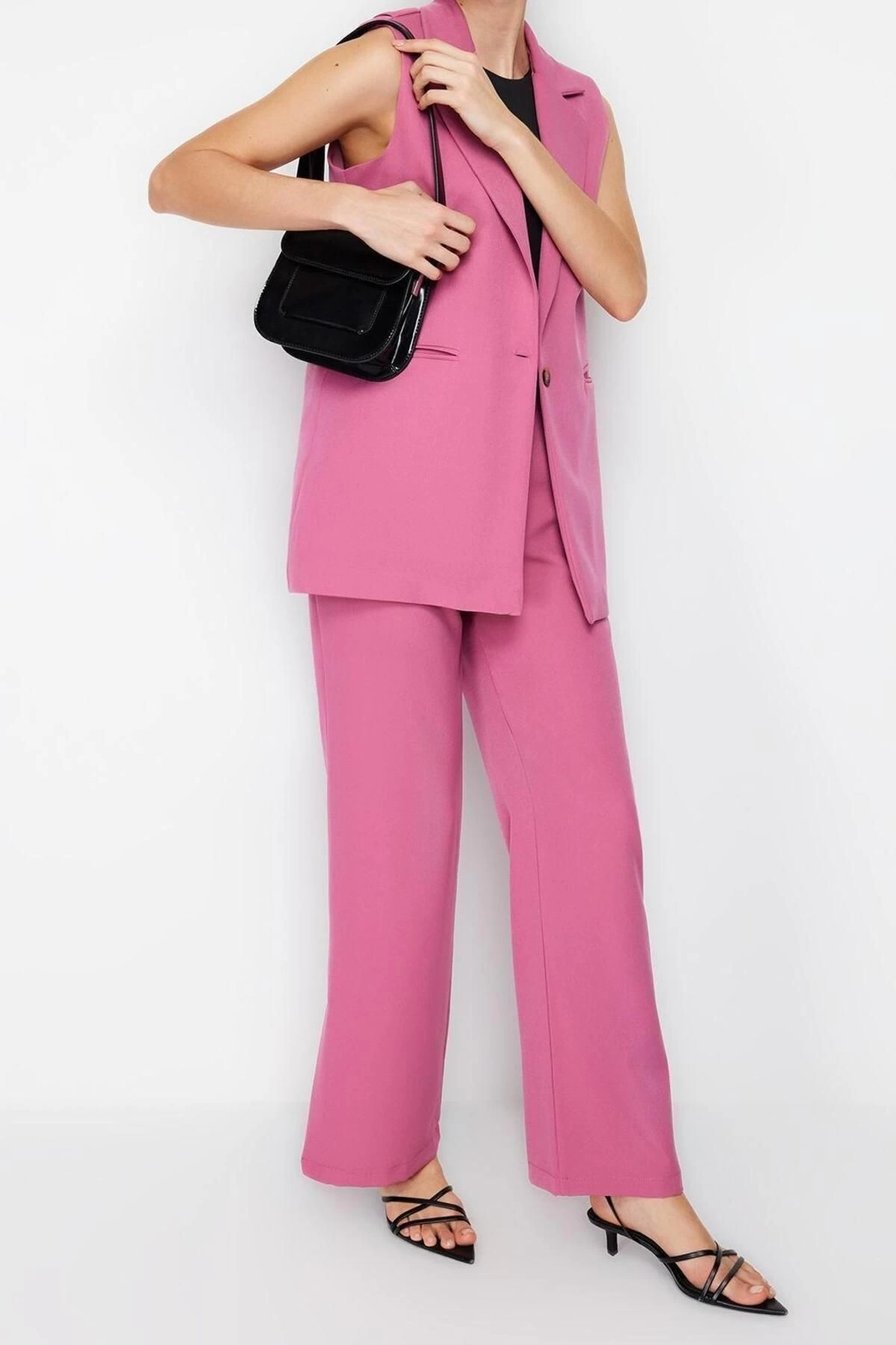 Moda Ceket Yaka Resmi Lila Regular Kalıp Yelek ve Wide Leg Geniş Paça Pantolon Dokuma Alt-Üst Takım ürünümüz, hem şıklığı hem de rahatlığı bir arada sunar.