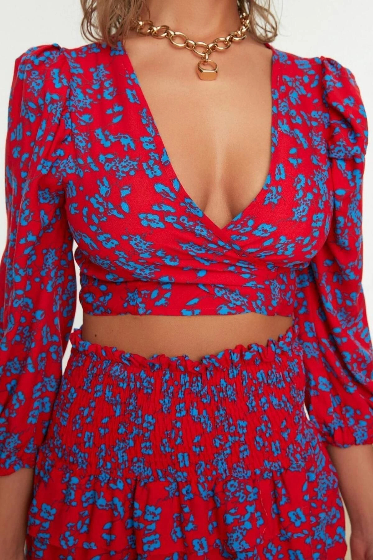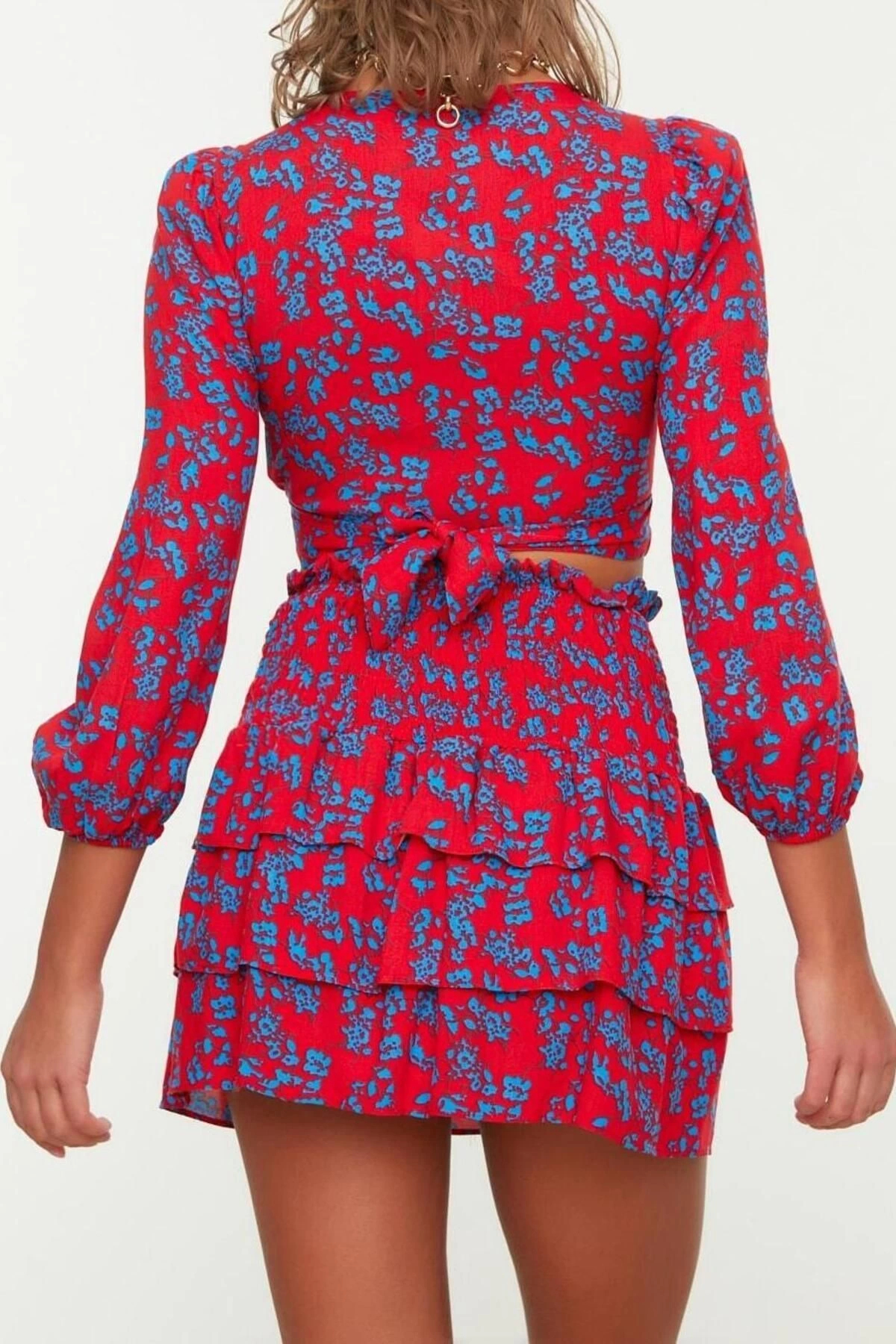 Moda Dokuma Baskılı Bisiklet Yaka Günlük Ev Dokuma Fırfırlı Bluz Etek Takım ürünümüz, hem şıklığı hem de rahatlığı bir arada sunar.