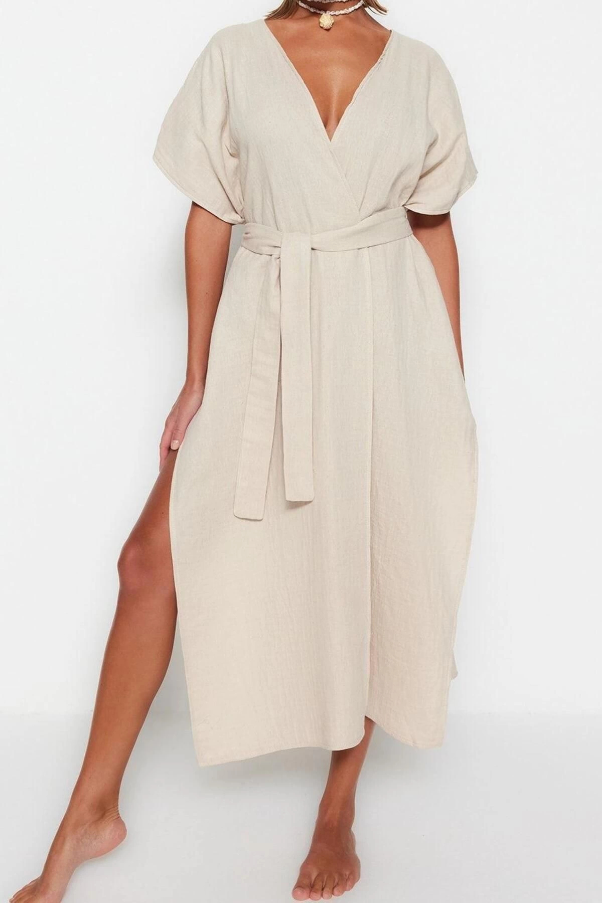 Moda Dokuma Oversize Kalıp Uzun V Yaka Standart Kol Müslin Kruvaze Düz Desen Kimono Kaftan ürünümüz, hem şıklığı hem de rahatlığı bir arada sunar.