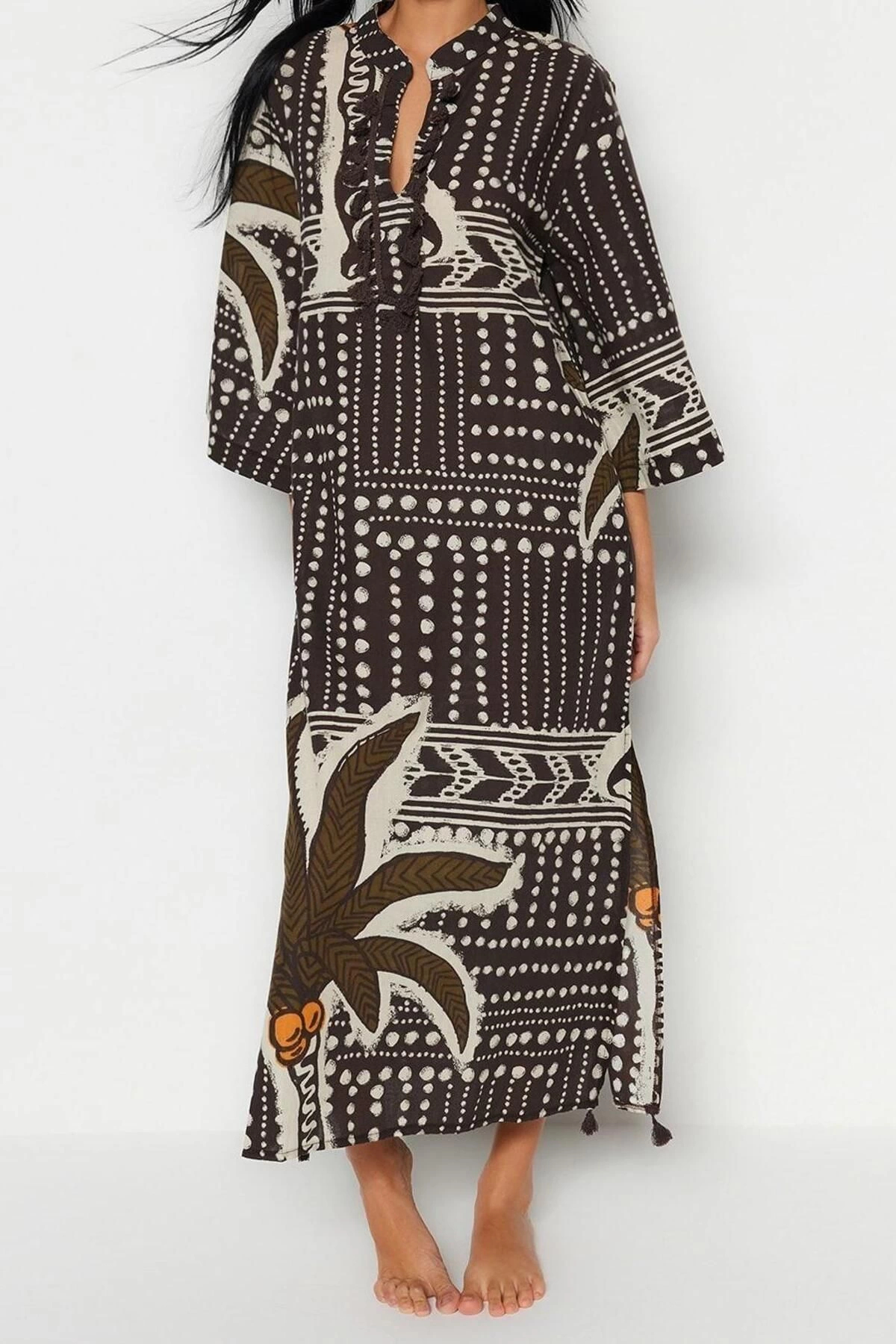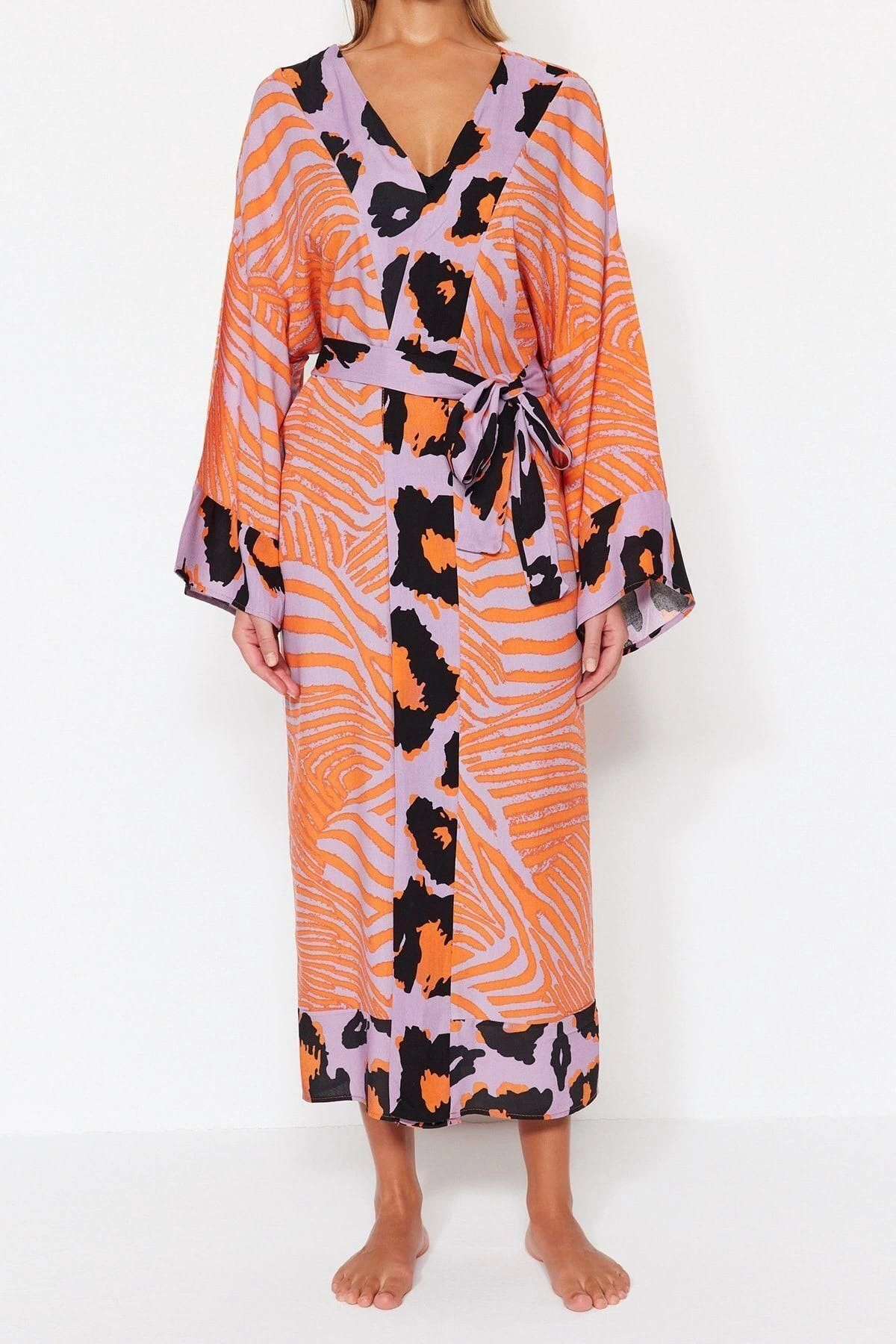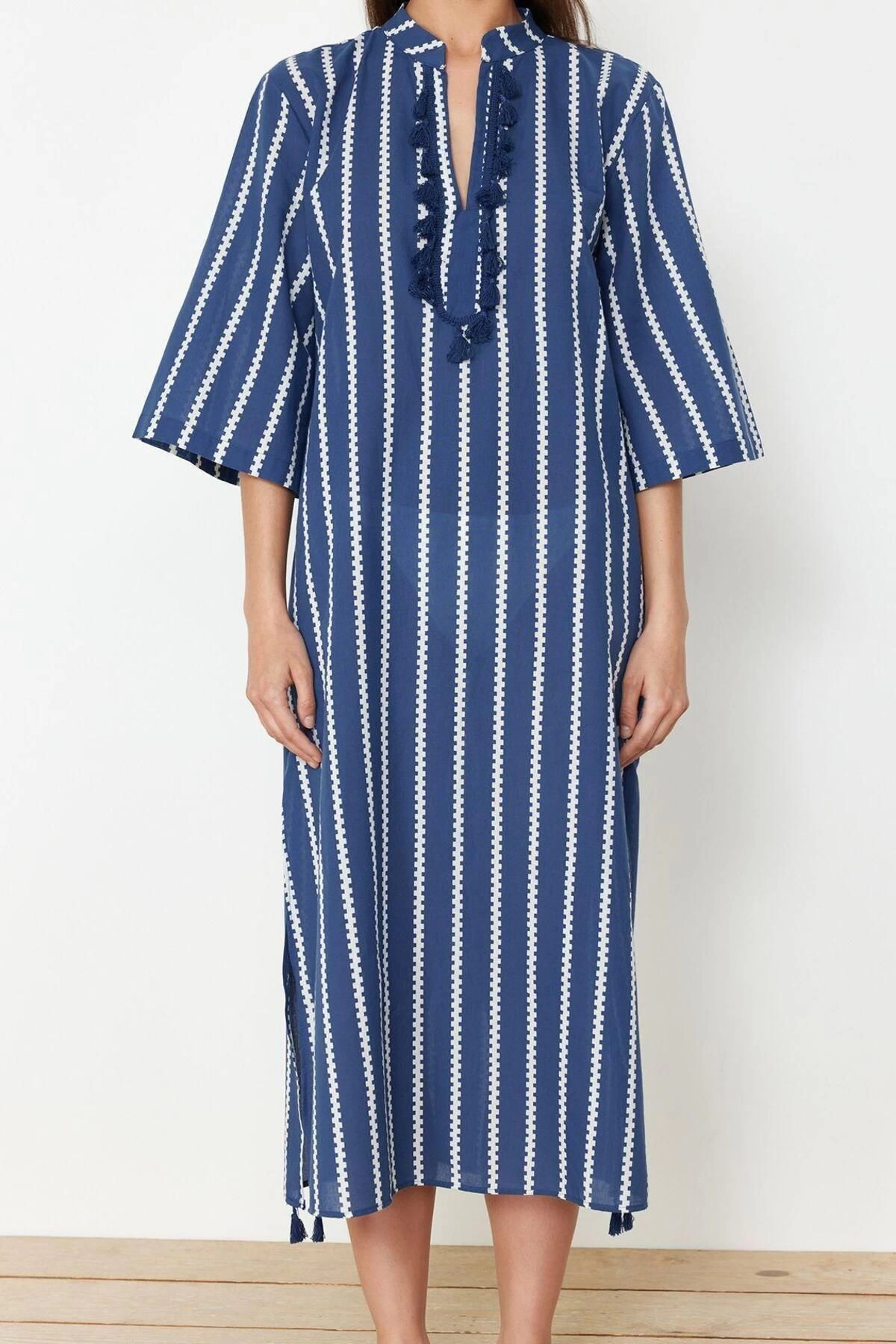 Moda Dokuma Rahat Kalıp Uzun Gömlek Yaka Standart Kol Vual Basic Çizgili Desen Kimono Kaftan ürünümüz, hem şıklığı hem de rahatlığı bir arada sunar.
