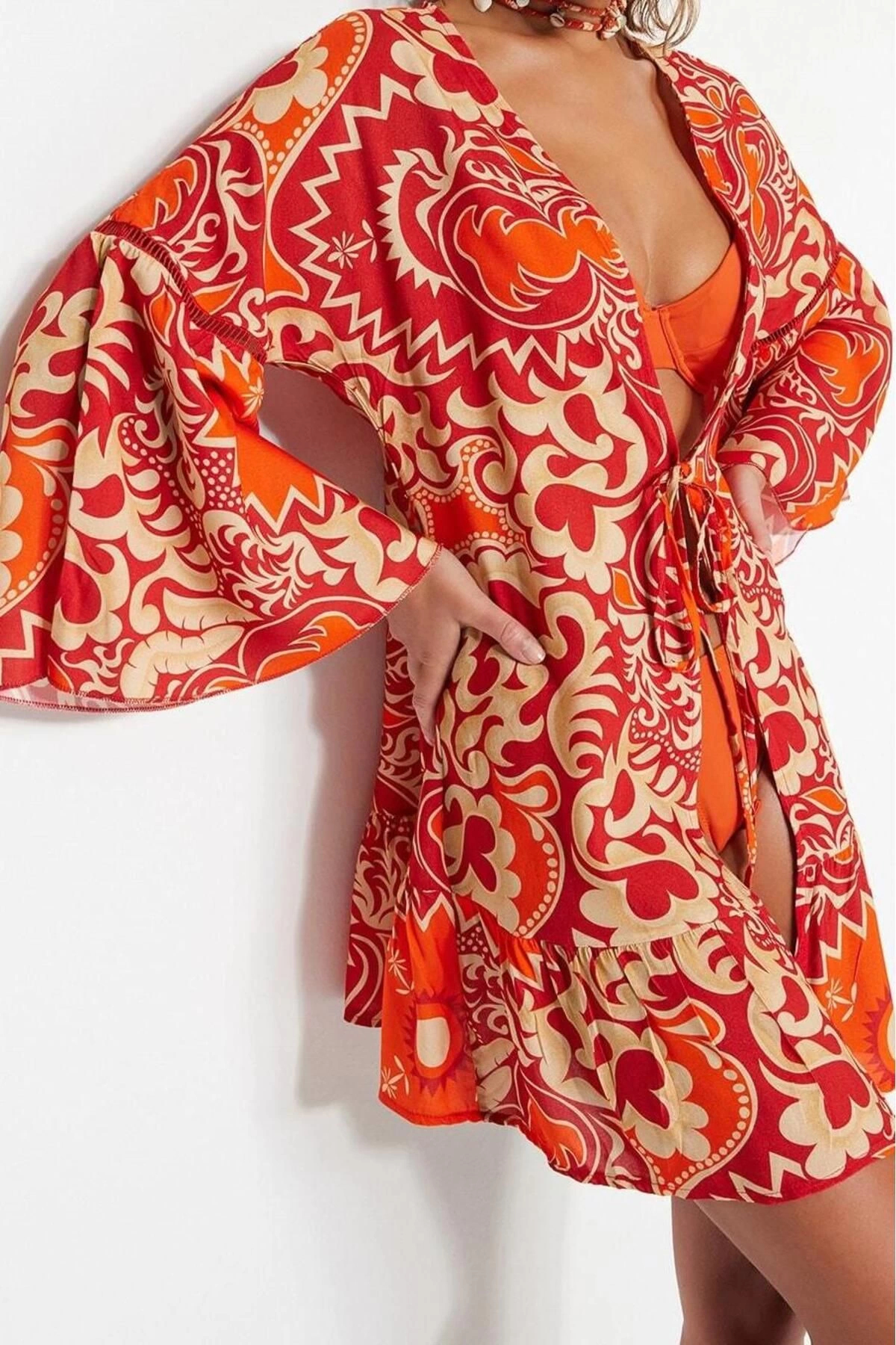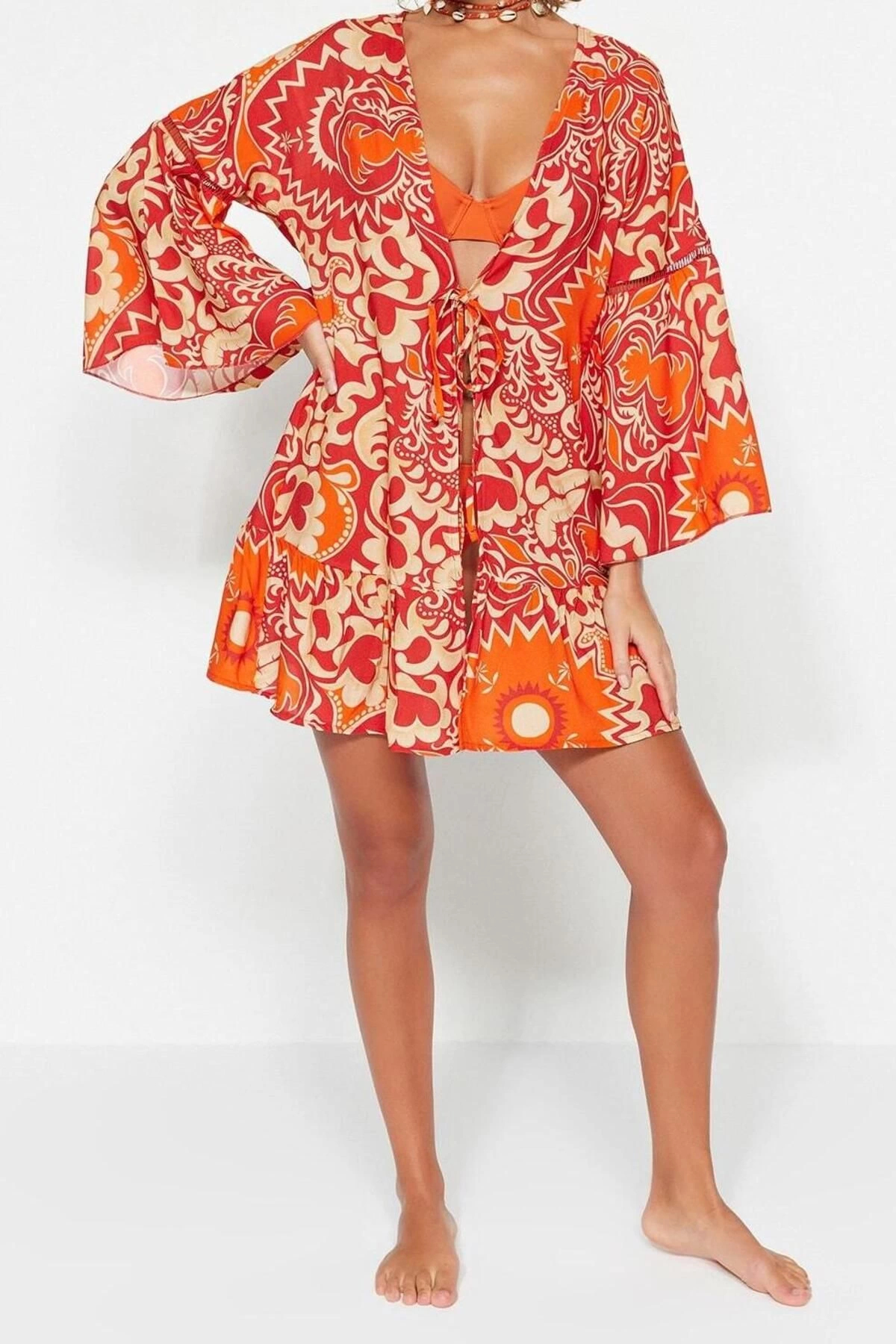 Moda Dokuma Regular Kalıp Crop V Yaka Standart Kol Shally Basic Etnik Desen Kimono Kaftan ürünümüz, hem şıklığı hem de rahatlığı bir arada sunar.