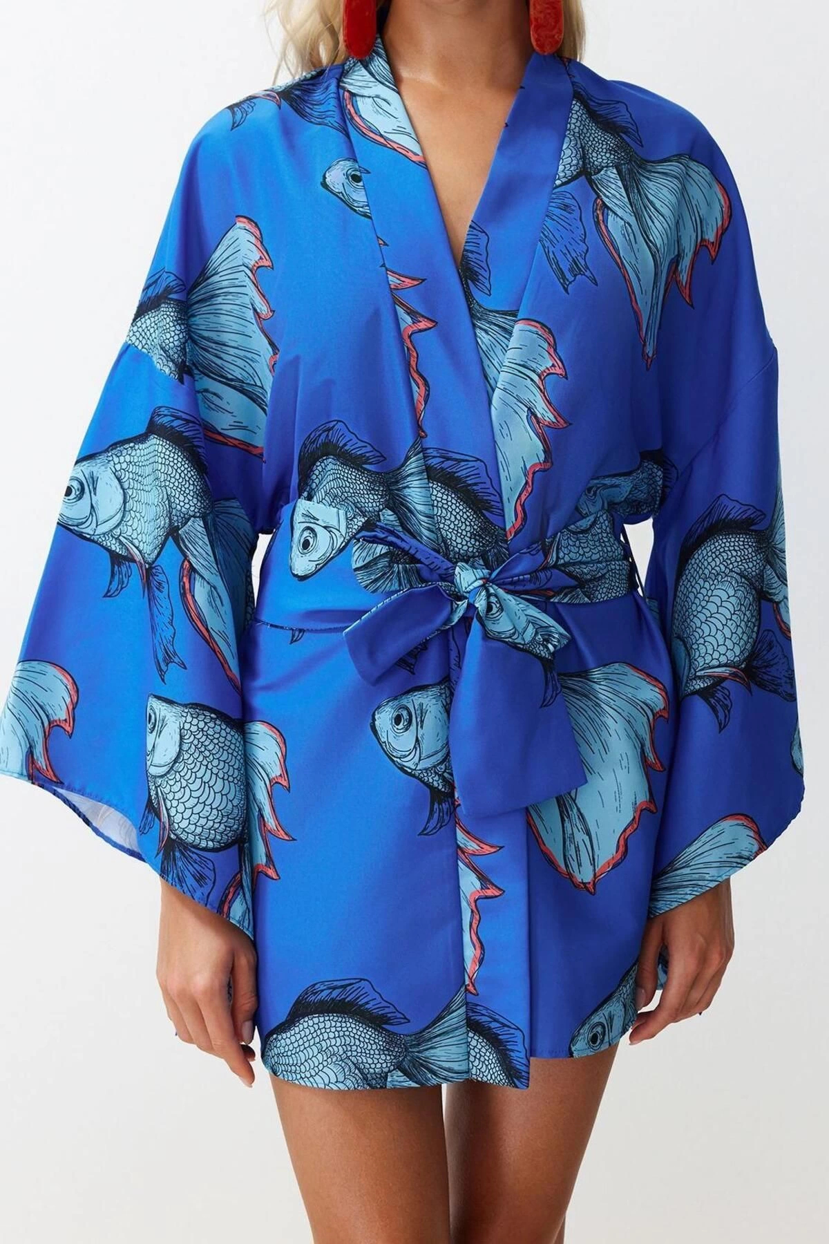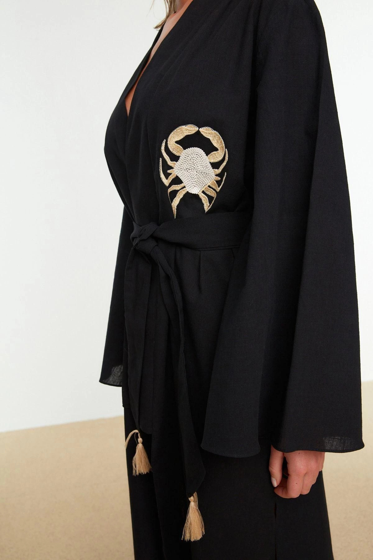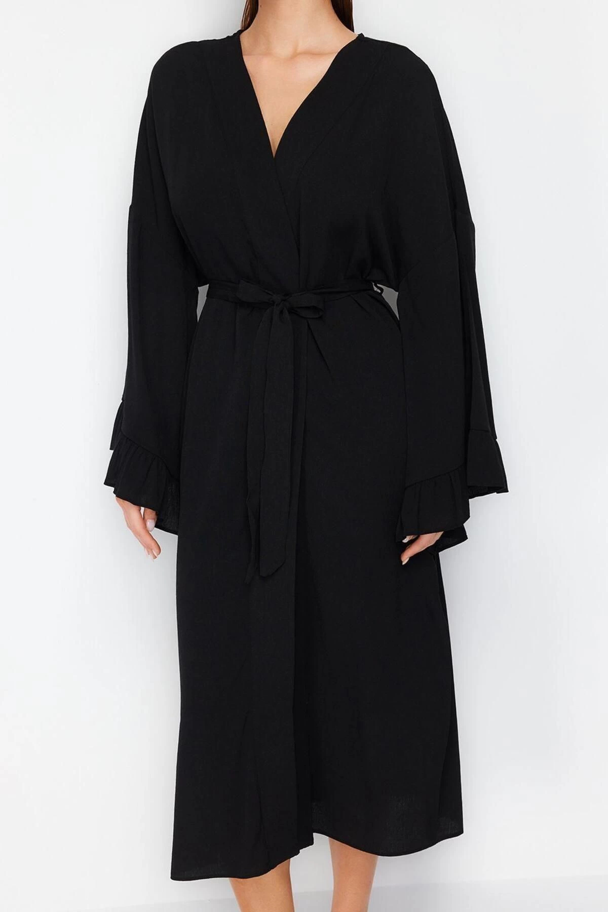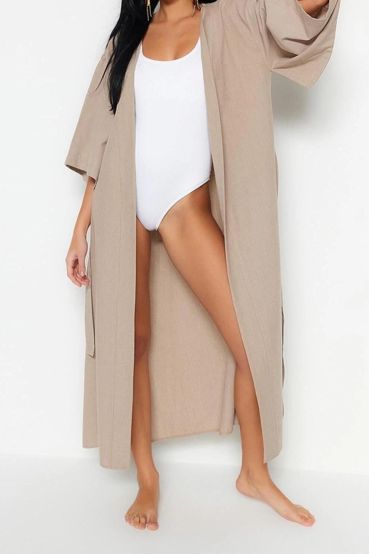 Moda Dokuma Regular Kalıp Midi V Yaka İspanyol Kol Keten görünümlü Basic Düz Desen Kimono Kaftan