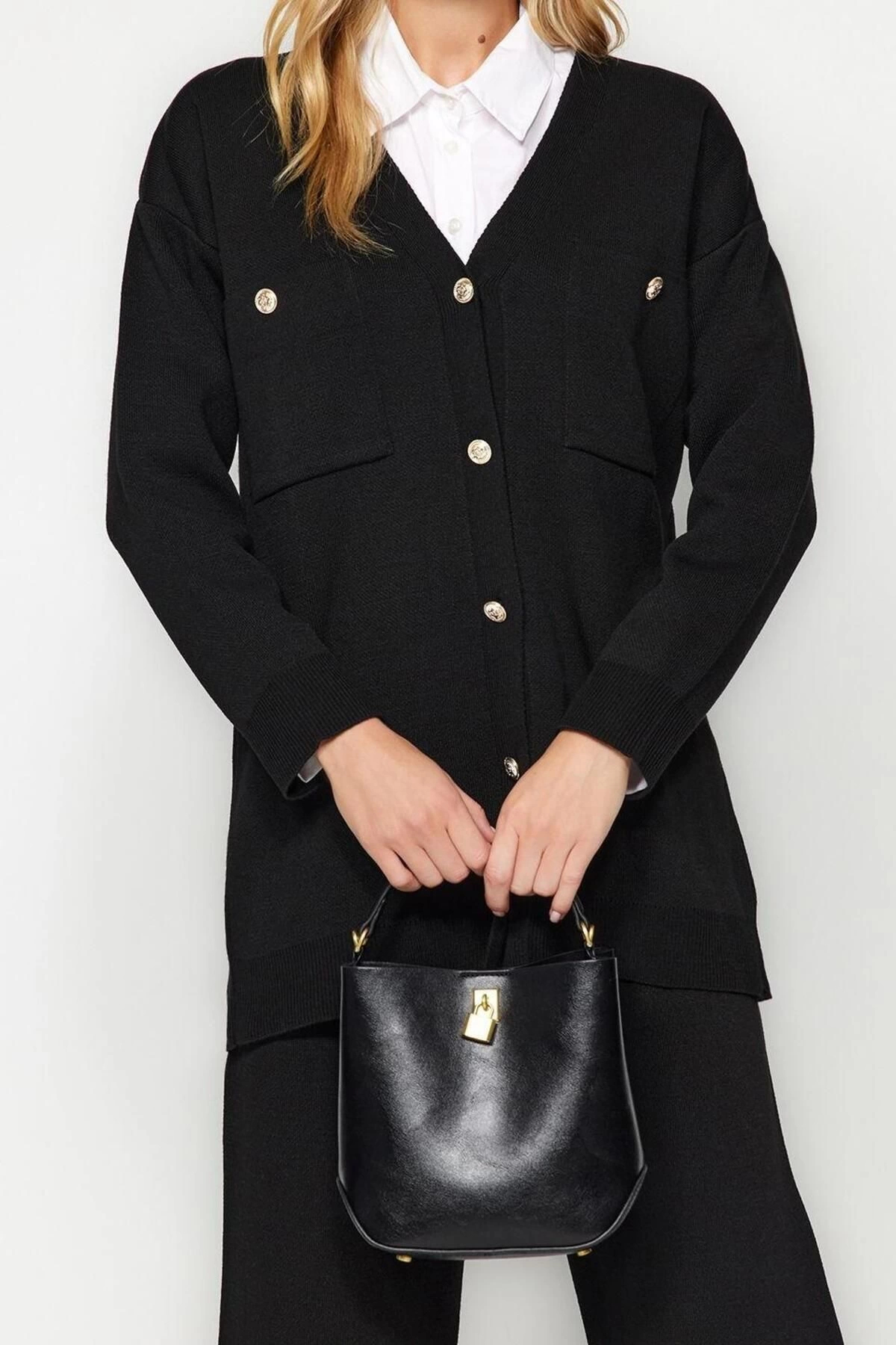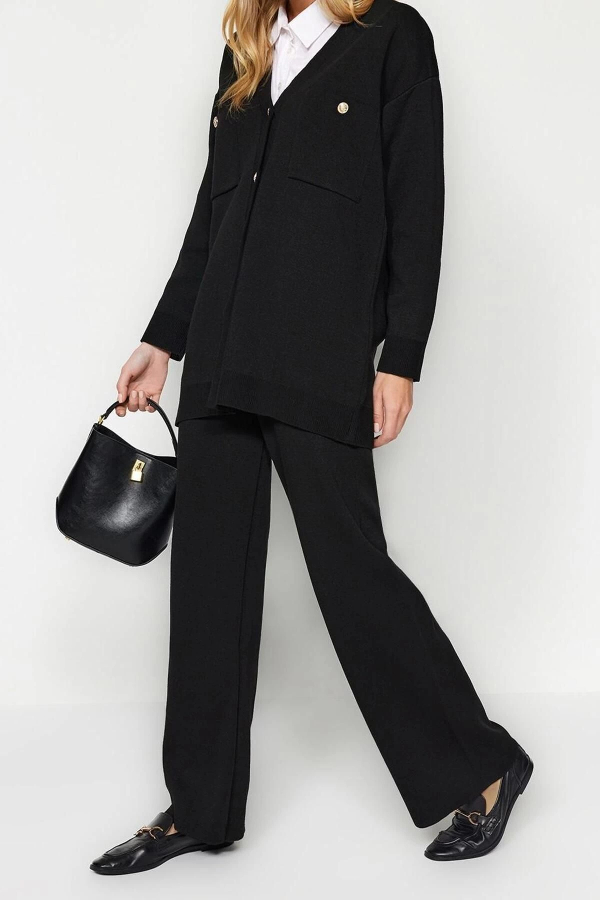 Moda Düz V Yaka Düşük Kol Casual Günlük Siyah Düğmeli Hırka-Pantolon Triko Alt-Üst Takım ürünümüz, hem şıklığı hem de rahatlığı bir arada sunar.