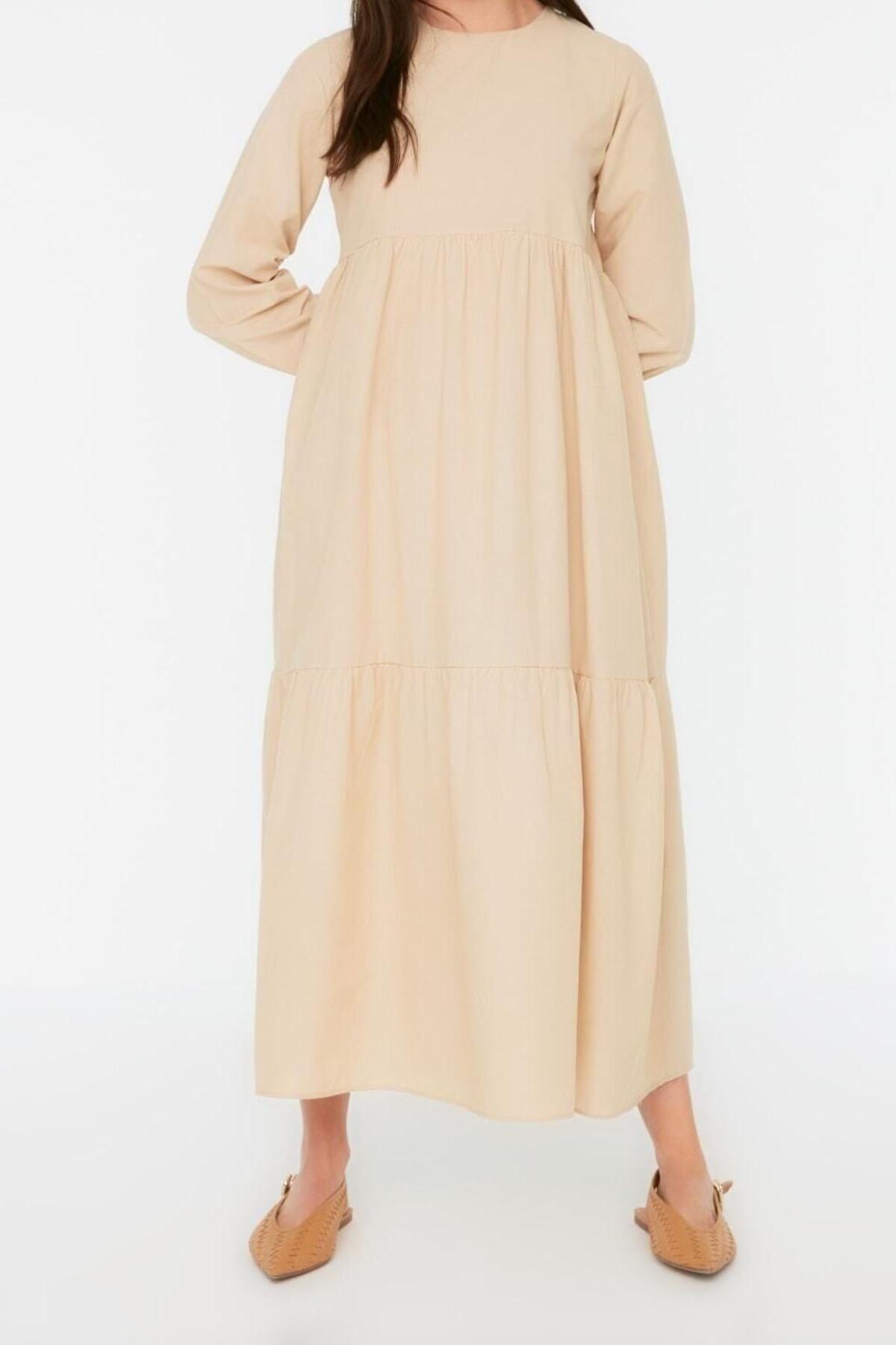 Moda Regular Casual Günlük Terrycotton Dokuma Bisiklet Yaka Uzun Kol Skater Maxi Boy Tesettür Elbise