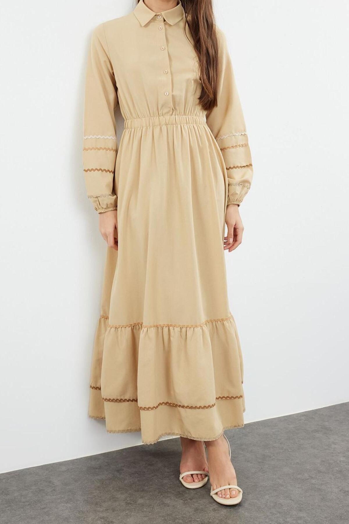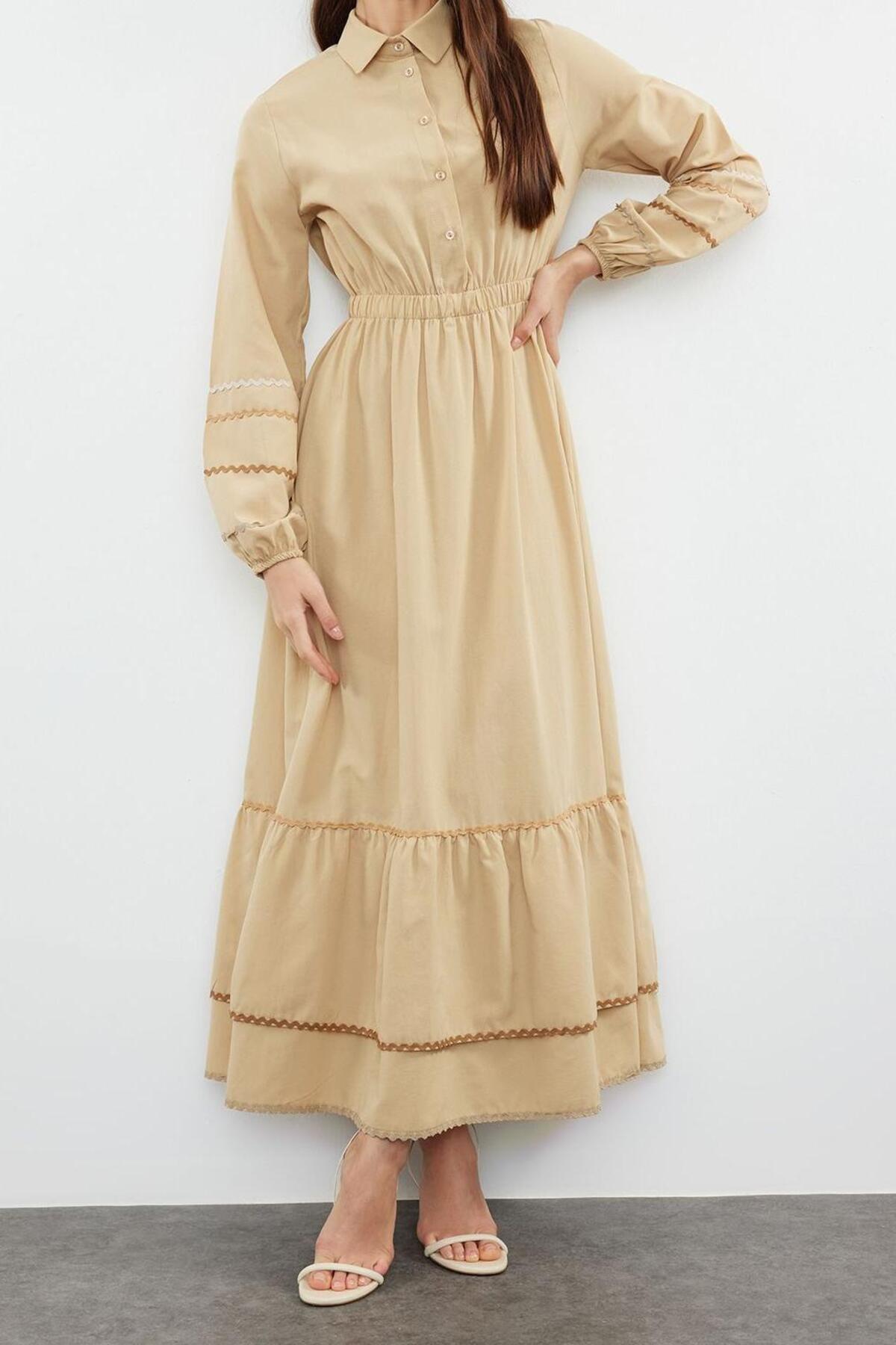 Moda Regular Casual Günlük Poplin Dokuma Gömlek Yaka Uzun Kol A-Line Maxi Boy Tesettür Elbise