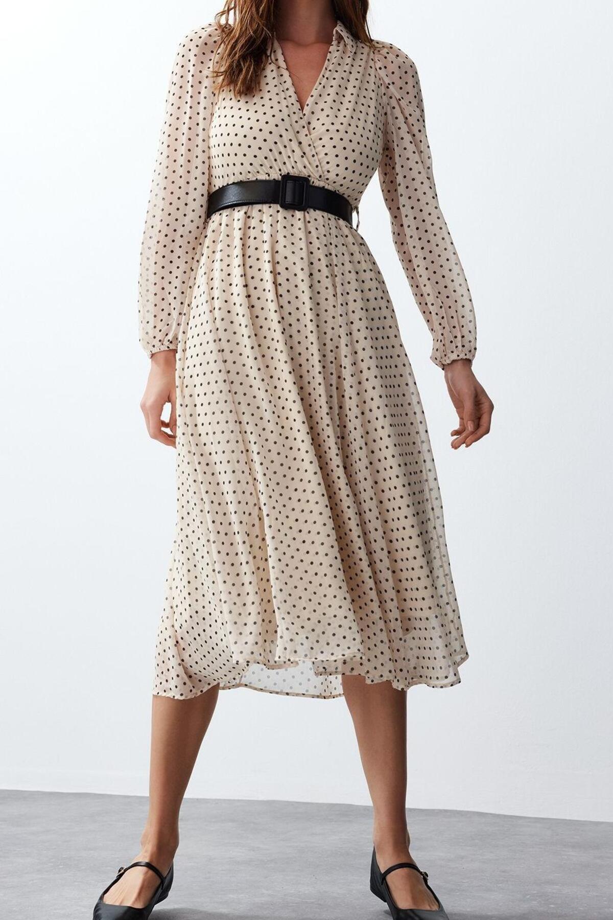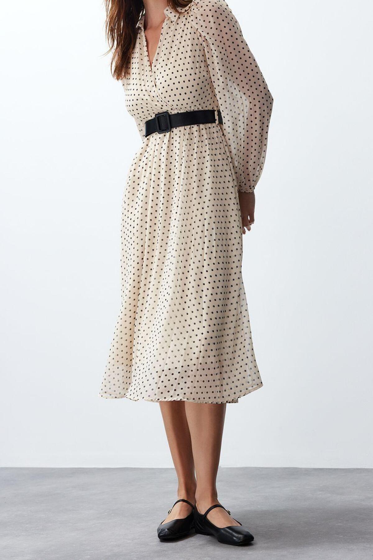 Moda Regular Gündüz Gece Şifon Dokuma Kruvaze Uzun Kol Skater Maxi Boy Elbise ile zahmetsiz stil keşfedin. ; gündüz / gece için mükemmeldir, bu elbise, görünümünüze sofistike bir dokunuş katan klasik bir tasarıma sahiptir. ; Rahat kesimi, gün boyu şık ve rahat kalmanızı sağlar.| Bu elbise, rahatlık ve şık tasarımı bir araya getirerek gardırobunuzda çok yönlü bir parça haline getirir. ; İster işlerinizle uğraşın ister arkadaşlarınızla buluşun, bu elbise hem şık görünmenizi hem de rahat hissetmenizi sağlar. ; | Model Bilgisi: Modelin Ölçüleri: Boy: 179cm(510) Göğüs: 85cm(33in) Bel: 60cm(23in) Kalça: 90cm(35in). ; | Mankenin üzerindeki ürün S368 bedendir.. ; | Materyal Bileşeni: 100% Polyester. ; | Kumaş Tipi: Dokuma. ; | Model Ön Boyu: 115,0 cm. ; | Ürününüzü daha uzun süreli kullanabilmeniz ve ürününüze uygun bakım yapabilmeniz için lütfen aşağıda belirtilen yıkama talimatına uyunuz.. ; | Stüdyo çekimlerinde renkler ışık farklılığından dolayı değişiklik gösterebilir.. ; | | Kumaş Tipi:Dokuma | Materyal:Polyester | Kalıp:Regular | Kol Boyu:Uzun | Kol Tipi:Balon Kol | Desen:Puantiyeli | Yaka Tipi:Kruvaze | Renk:Bej | Ürün Detayı:Kemerli | Ürün Tipi:Düz | Astar Durumu:Astarlı | Boy:Maxi | Persona:Feminine | Siluet:Skater | Ortam:Gündüz / Gece | Dokuma Tipi:Şifon | Kemer/Kuşak Durumu:Kemerli | Sürdürülebilirlik Detayı:Hayır | Materyal Bileşeni:100% Polyester | Yıkama Talimatı:T10 | Yaş:Tüm Yaş Grupları |;