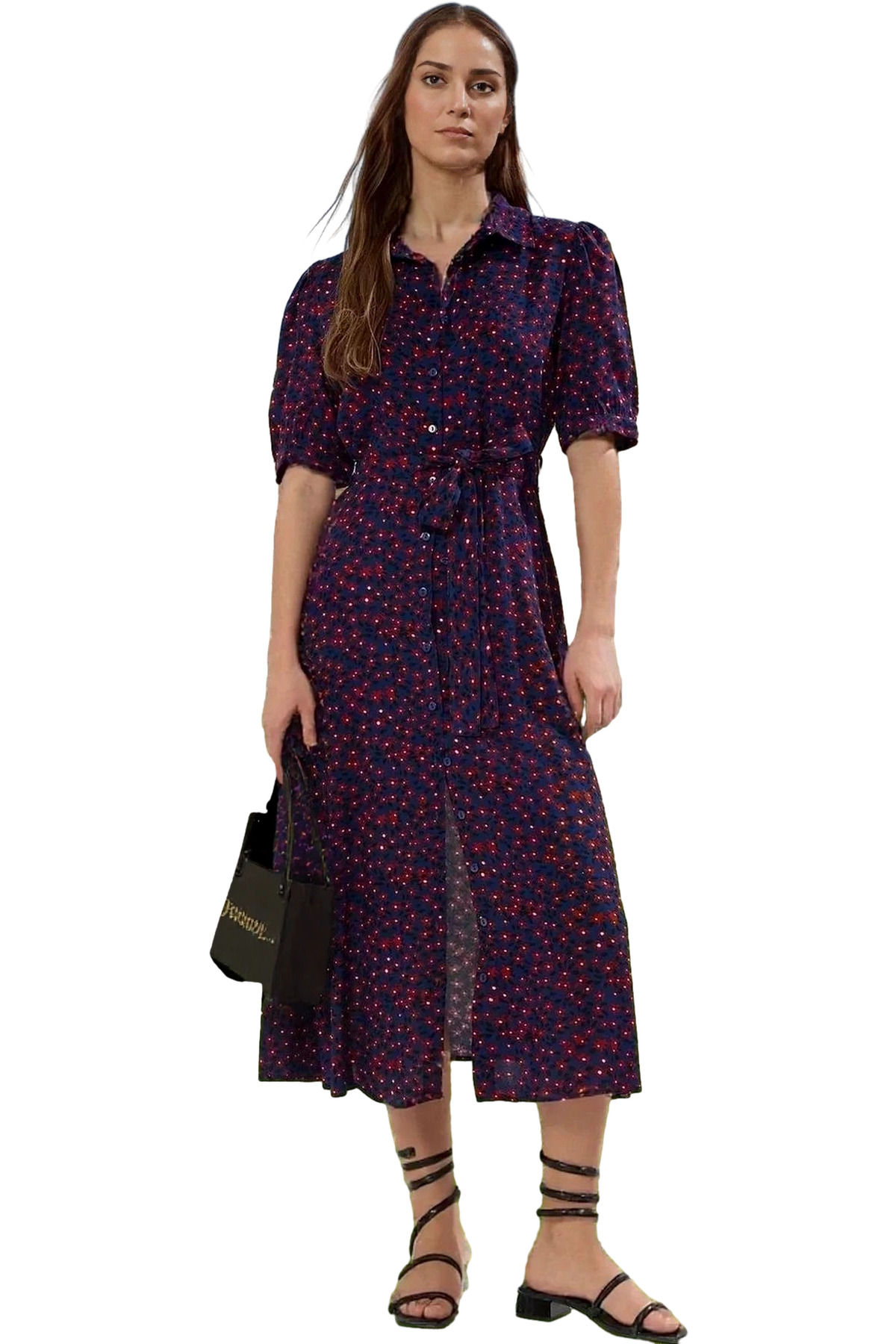 Moda Stil Regular Gömlek Yaka Midi Boy Desenli Kuşaklı Dokuma Viskon Gömlek Elbise