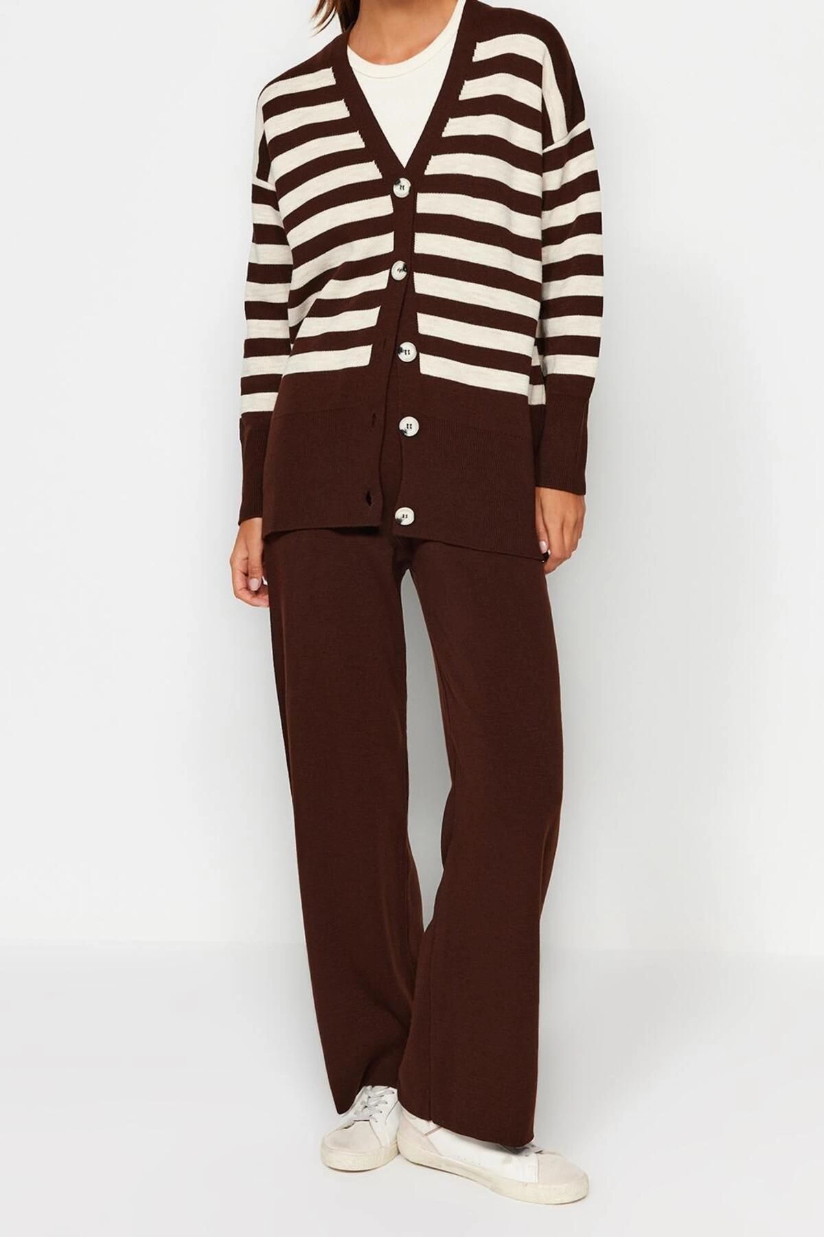 Moda Triko Çizgili V Yaka Düşük Kol Casual Günlük Hırka Pantolon Triko Alt-Üst Takım ürünümüz, hem şıklığı hem de rahatlığı bir arada sunar.
