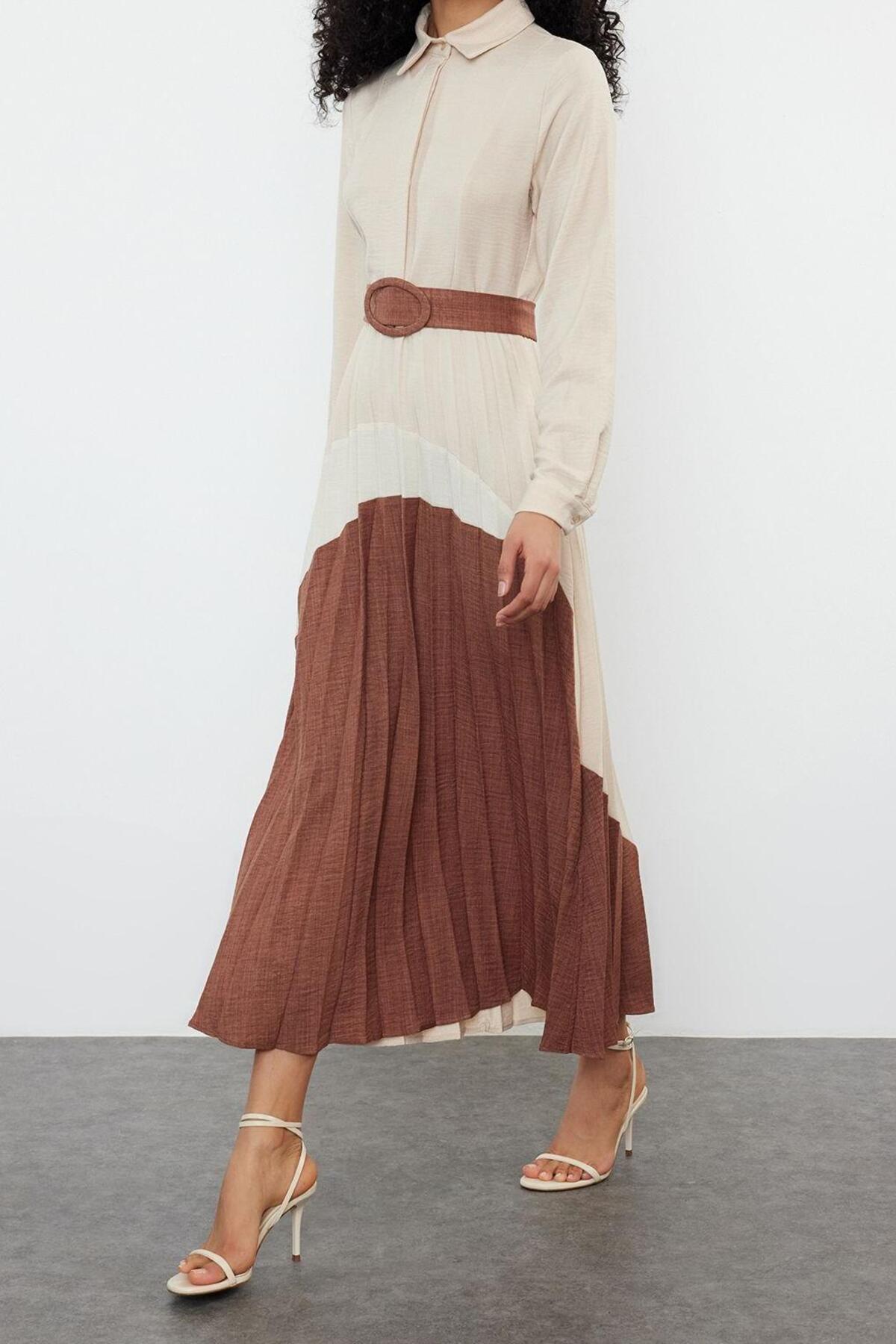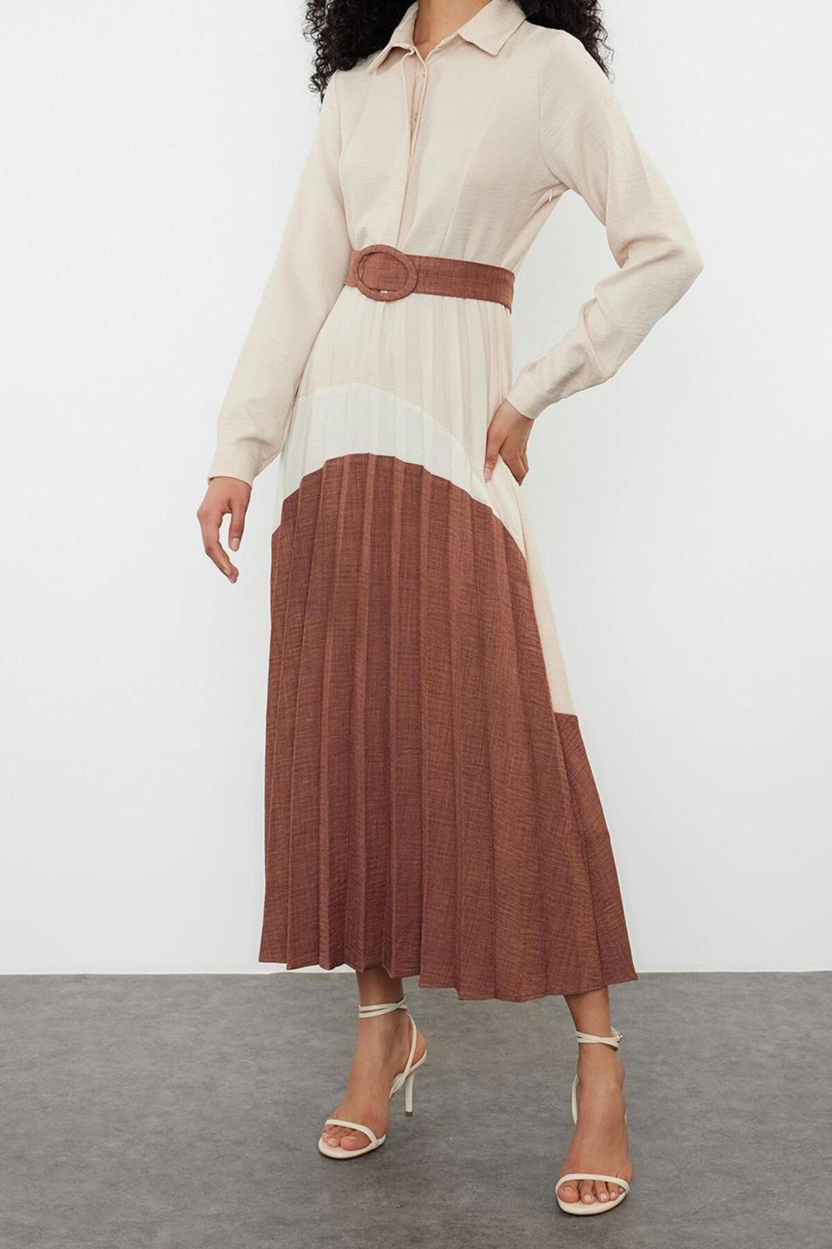 Gömlek yaka tasarımı, elbiseye sofistike bir hava katarken, uzun standart kol yapısı mevsim geçişlerinde pratik bir kullanım sağlar. Kemerli yapısı sayesinde belinizi istediğiniz gibi şekillendirerek kendinize özgü bir siluet yaratabilir, şıklığınıza kişisel bir dokunuş katabilirsiniz. Astarsız olması sayesinde sıcak havalarda bile maksimum nefes alabilirlik sunan bu maxi boy elbise, hareket özgürlüğünüzü kısıtlamaz. Dayanıklı dokuma kumaşı uzun süreli kullanıma olanak tanırken, kolay ütülenebilir ve makinede yıkanabilir özelliği ile bakımını zahmetsiz hale getirir.