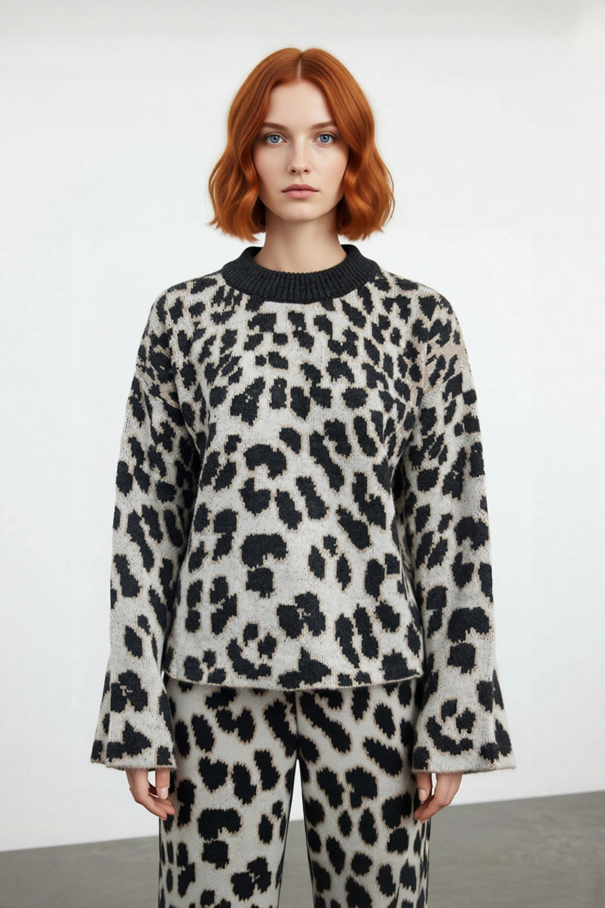 Ürün Özellikleri: Oversize kalıp, akrilik polyester materyal, leopar desen, bisiklet yaka, düşük kol, triko kumaş, gri renk.