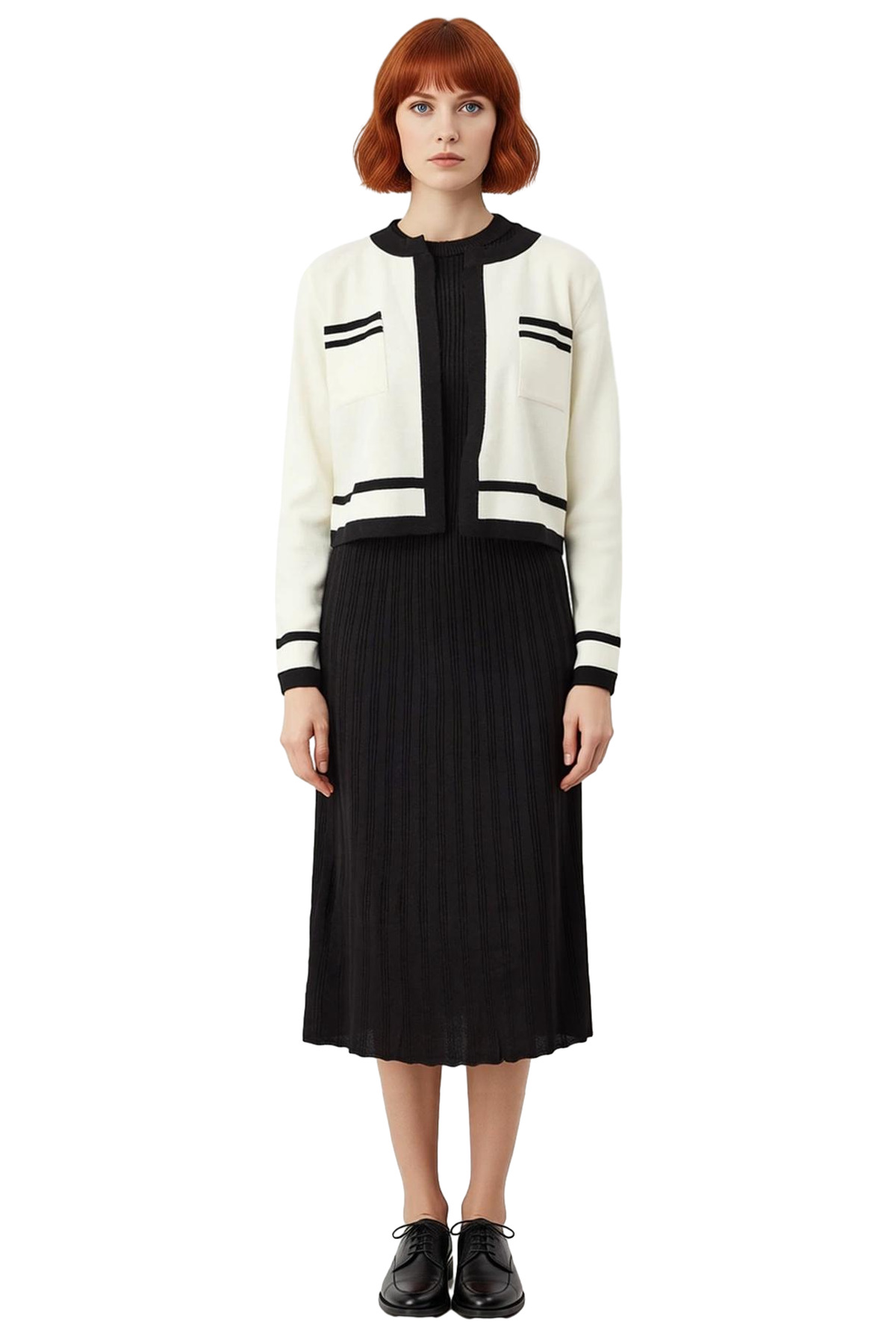 Ürün Özellikleri: A-line kalıp, 100% akrilik materyal, renk bloklu desen, bisiklet yaka, standart uzun kol, triko kumaş, siyah renk, midi boy.