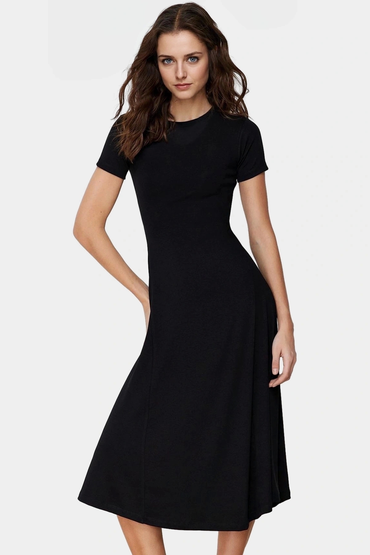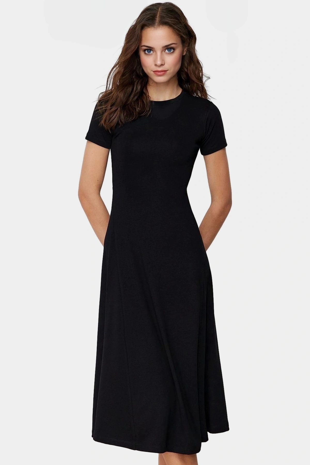 Nefes Alan Örme Viskoz Elbise Kısa Kol Midi Boy Bisiklet Yaka Casual Tarz Premium Kalite - Görsel 4