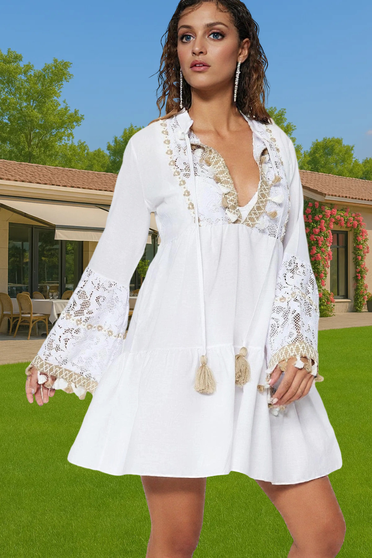 Yaz aylarının vazgeçilmez parçası olacak bu şık mini elbise, %100 pamuktan üretilen dokuma kumaş yapısıyla gün boyu konfor ve ferahlık sunuyor. V yakasıyla feminen bir tarz yakalarken, A-line kesimi her vücut tipine mükemmel uyum sağlıyor. Uzun kolları güneşin zararlı ışınlarından korurken, zarif dantel detayları ve püsküllerle süslenmiş tasarımıyla plajda veya günlük kullanımda dikkatleri üzerinize çekeceksiniz. Bu elbiseyle yazın tadını çıkarırken şıklığınızdan asla ödün vermeyeceksiniz.