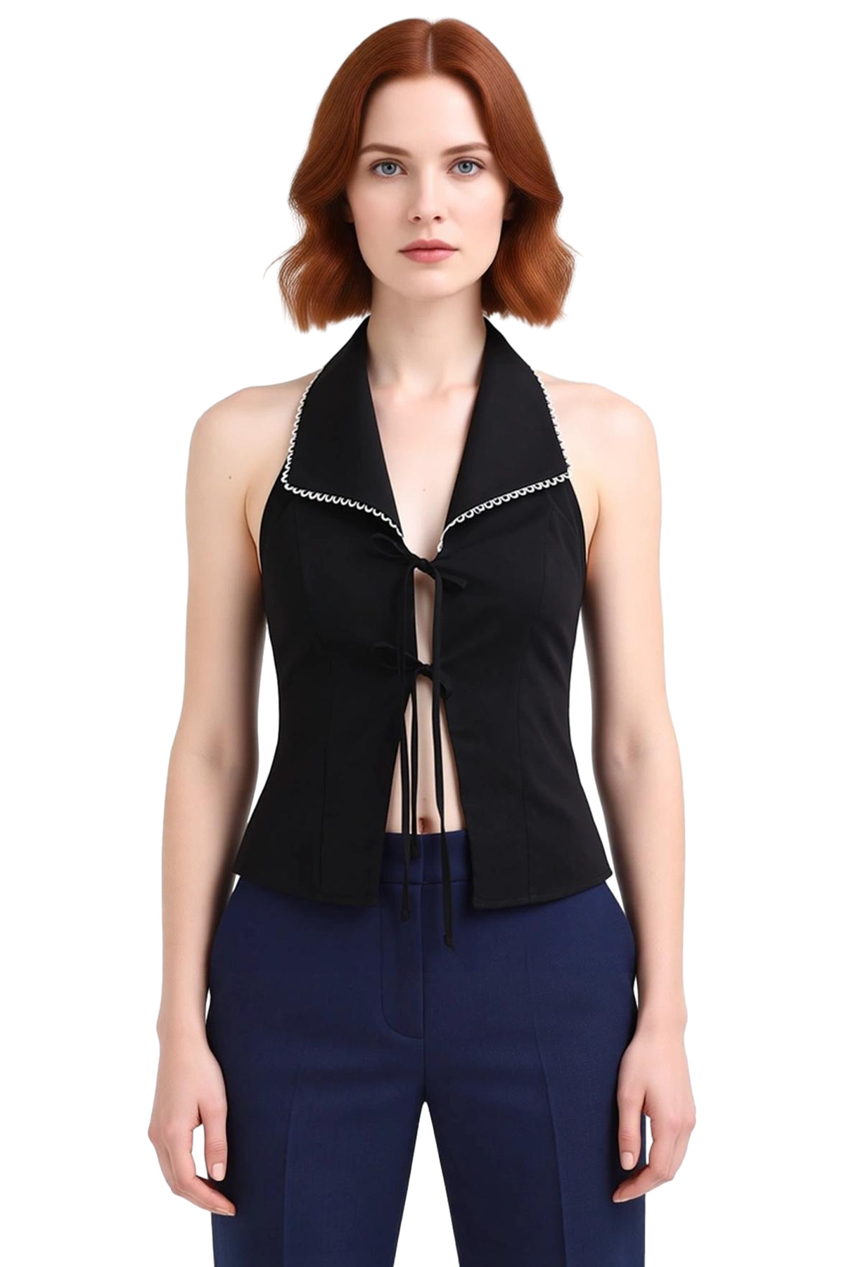 Bu şık ve rahat siyah bluzumuz, yaz aylarında hem şık hem de konforlu olmak isteyenler için ideal. %23 pamuk ve %77 polyester karışımı, nefes alabilir ve hafif bir yapı sunarak, gün boyu serin ve rahat kalmanıza yardımcı olur. Özenle tasarlanmış regular kalıbı, her vücut tipine mükemmel uyum sağlar. Bağcıklı detayı, bluza modern ve feminen bir hava katarak, tarzınızı ön plana çıkarır. Gömlek yakası, her zaman şık ve zarif görünmenizi sağlar. Kolsuz tasarımıyla sıcak günlerde serin kalırken, basic silüetiyle her türlü kombinasyon için uygundur.