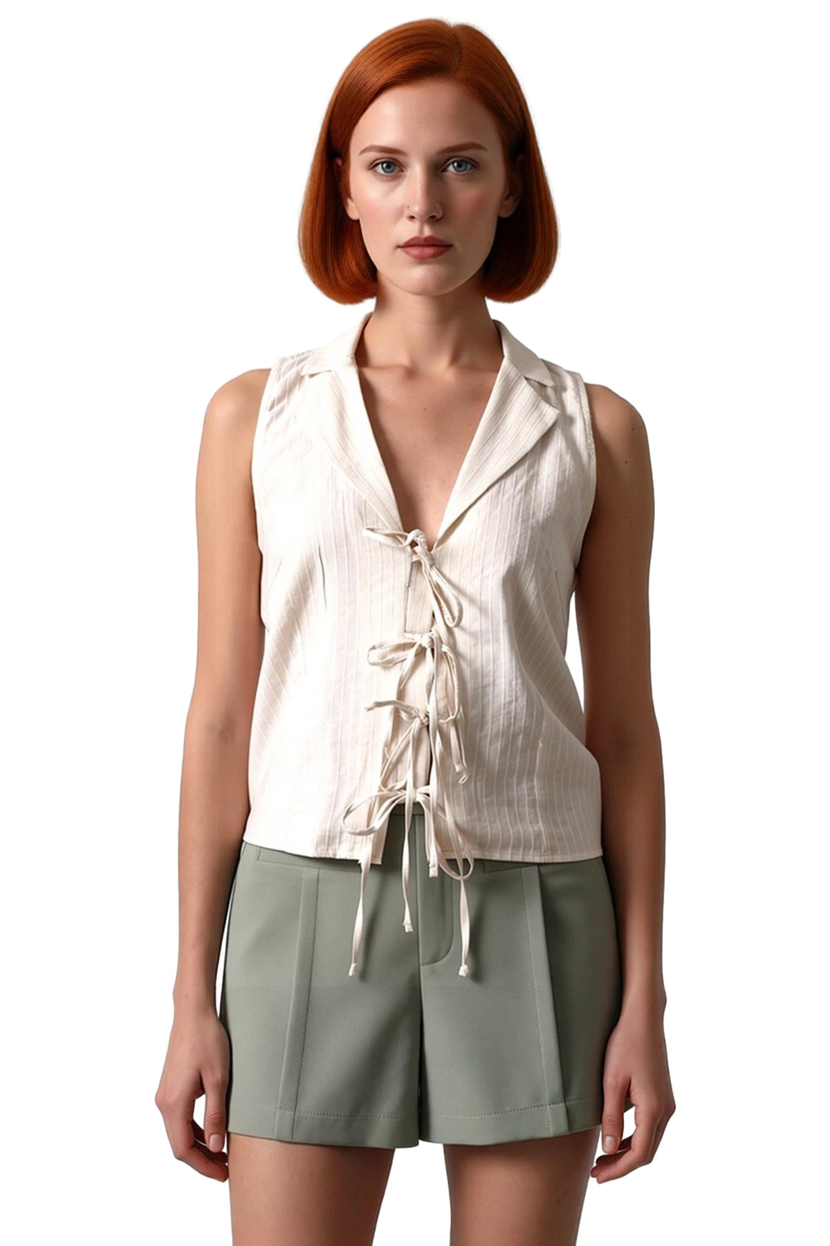 Önü Bağcıklı Dokuma Bluz Rahat Şık Yazlık Keten Görünümlü Pamuklu Günlük Kullanım İçin - Görsel 3