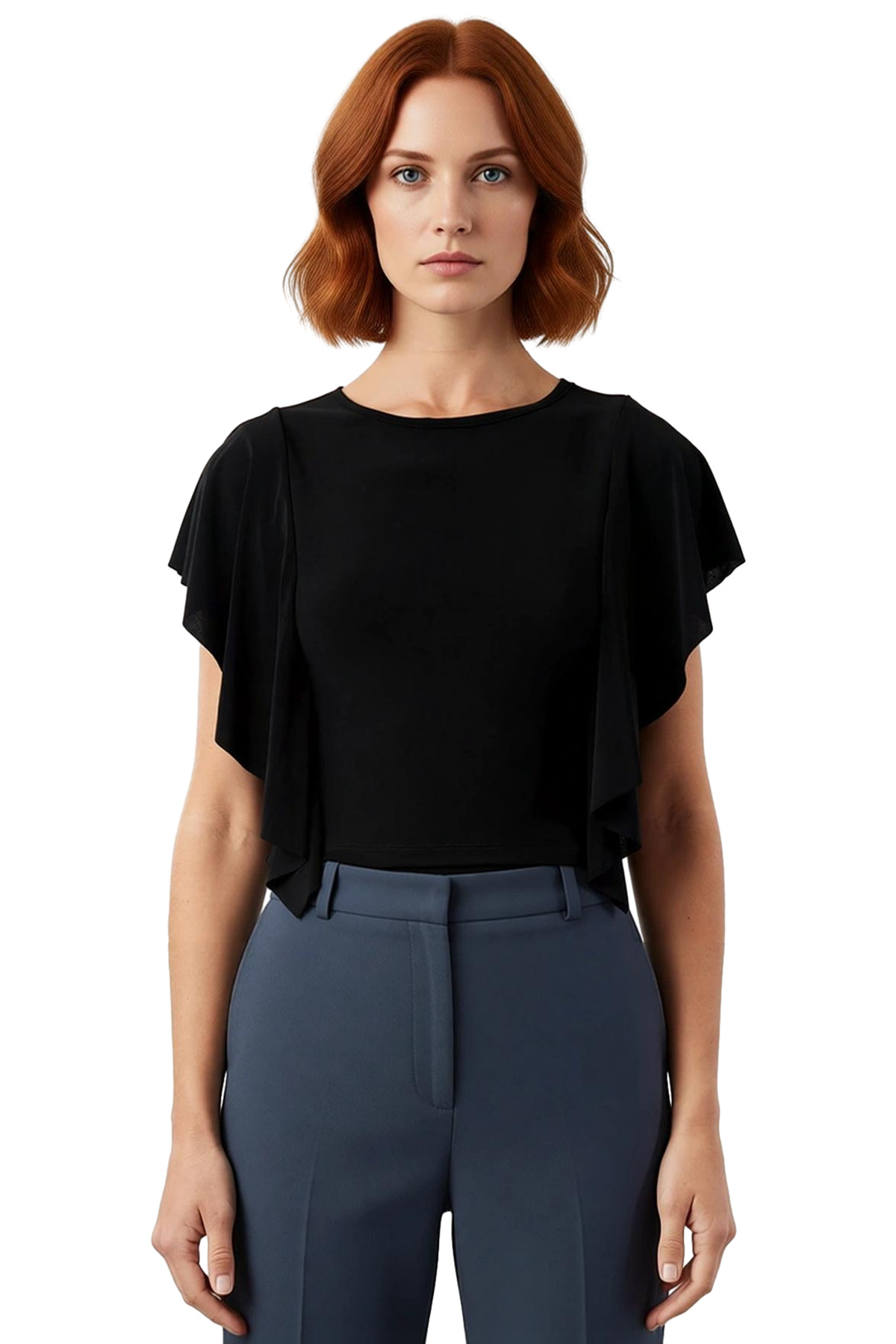 Bu sezonun trend parçalarından biri olan siyah crop bluz, gardırobunuza şıklık ve modernlik katacak. Yumuşak ve esnek örme kumaşıyla gün boyu rahatlık sunarken, bisiklet yakası ve fırfırlı kollarıyla feminen bir tarz yaratmanıza yardımcı olur. Cepsiz tasarımıyla minimalist bir görünüm sergilerken, kısa boyu ile farklı kombinlere uyum sağlar.