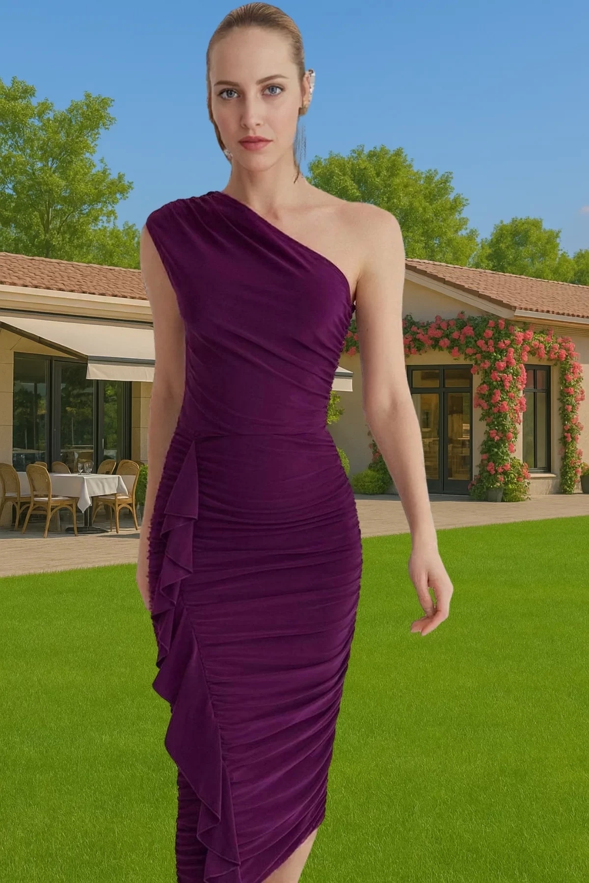 Yüksek kaliteli Sandy dokuma kumaş, nefes alabilir ve rahat bir kullanım sağlar. Vücudu saran yapısıyla her vücut tipine uyum sağlar ve şık bir silüet oluşturur. Asimetrik yaka ve tek omuz tasarımı ile feminen bir hava katarken, yan taraftaki fırfır detayı, elbisenin hareketli ve dinamik görünmesini sağlar. Elbisenin kolay bakımı, uzun ömürlü kullanımını garanti eder.