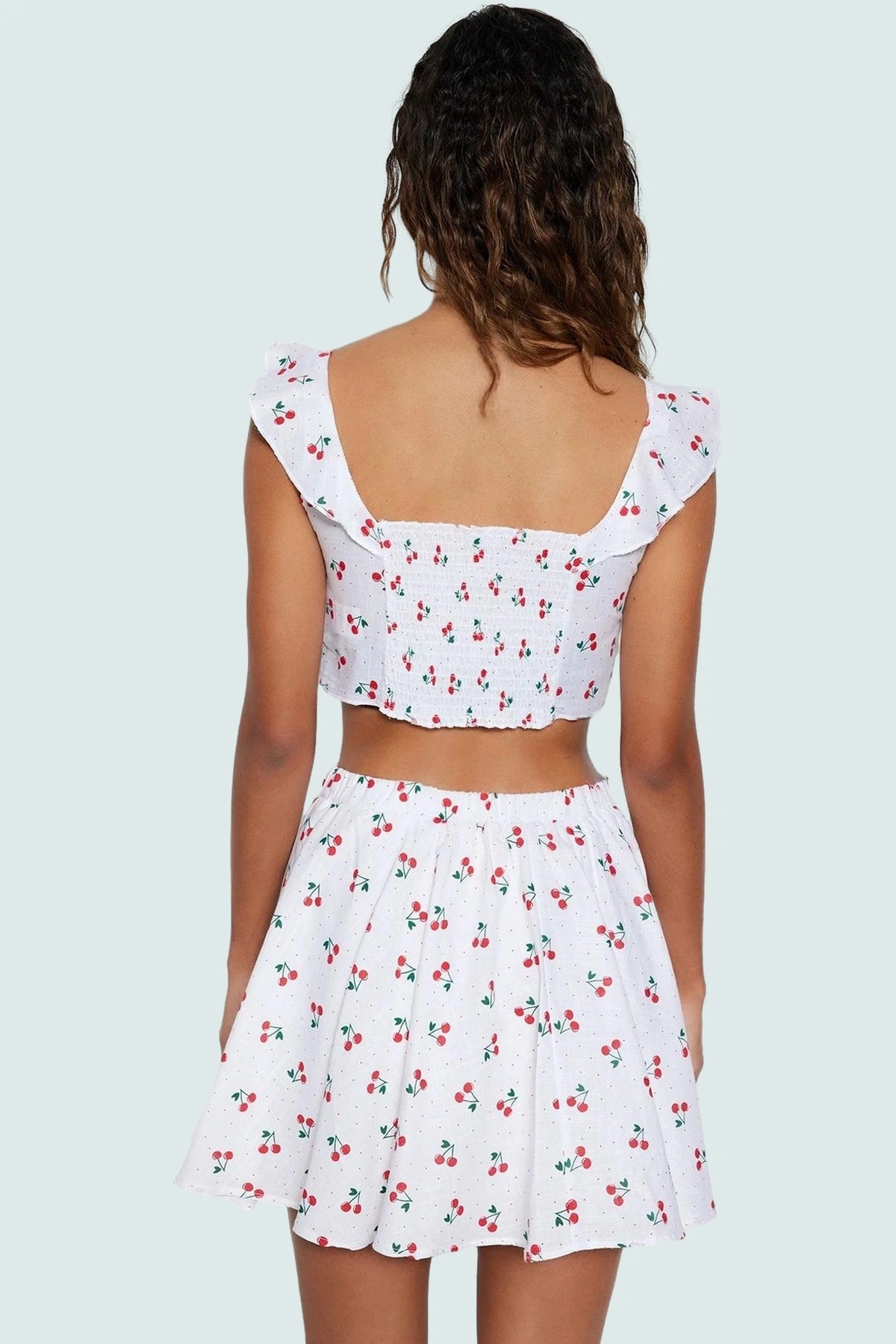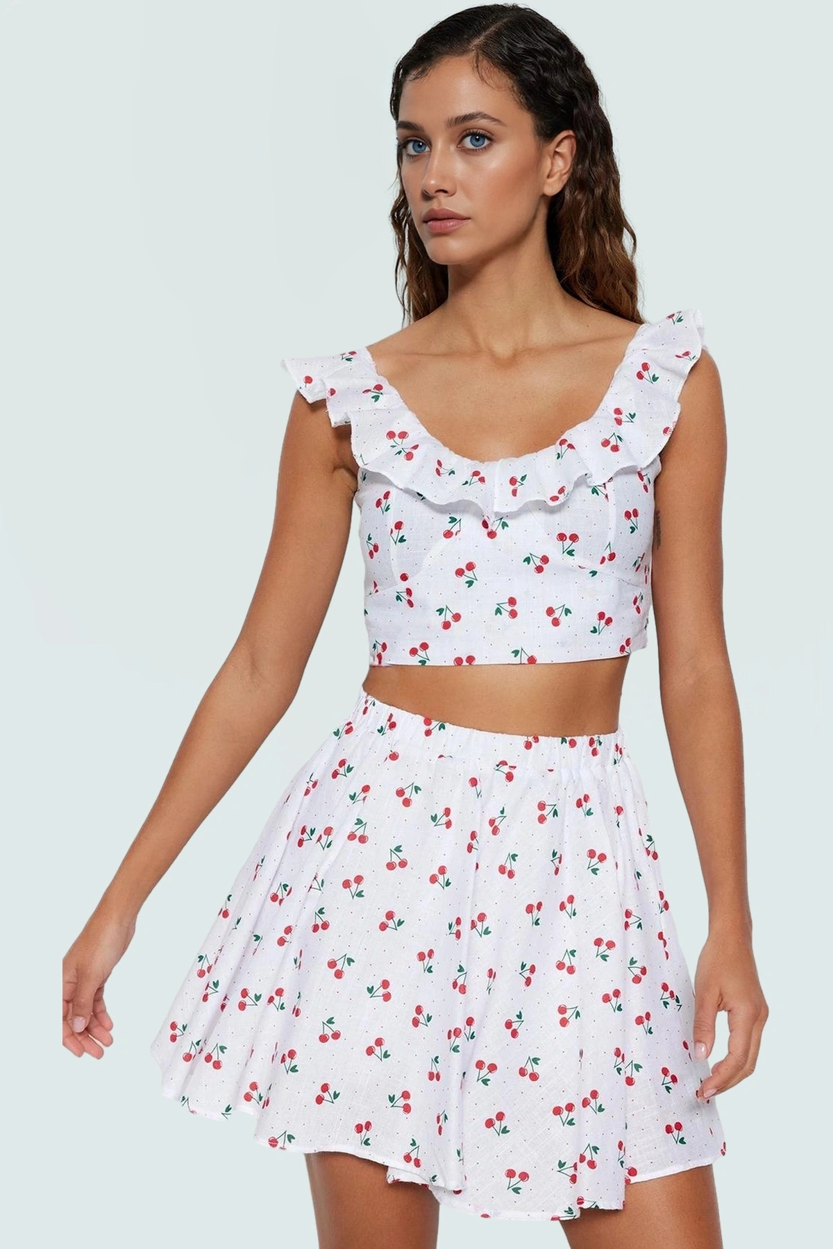 Yaz aylarının enerjik ve şık ruhunu yansıtan bu 100% pamuklu çilekli bluz etek takımını keşfedin! Nefes alan, hafif ve yumuşak dokusuyla gün boyu konfor sağlar. Kolsuz tasarımı ve bisiklet yakasıyla sıcak günlerde serin kalmanıza yardımcı olurken, fitted kalıbı vücut hatlarınızı zarifçe ortaya koyar. Geniş paçalı eteğiyle özgürce hareket edebilir, plajda, havuz başında veya günlük kombinlerinizde şıklığınızdan ödün vermezsiniz. Modelin ölçüleri: Boy: 173 cm, Göğüs: 80 cm, Bel: 59 cm, Kalça: 89 cm. Manken S beden giymektedir. Makinede 35 derecede yıkayabilirsiniz.
