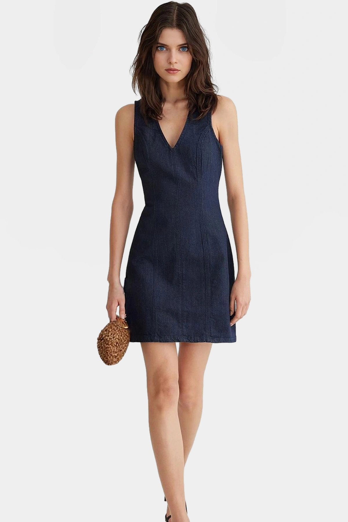 Pamuk Denim Mini Elbise V Yaka Kolsuz Yazlık Rahat Günlük Yüksek Kalite Seçkin Malzeme
