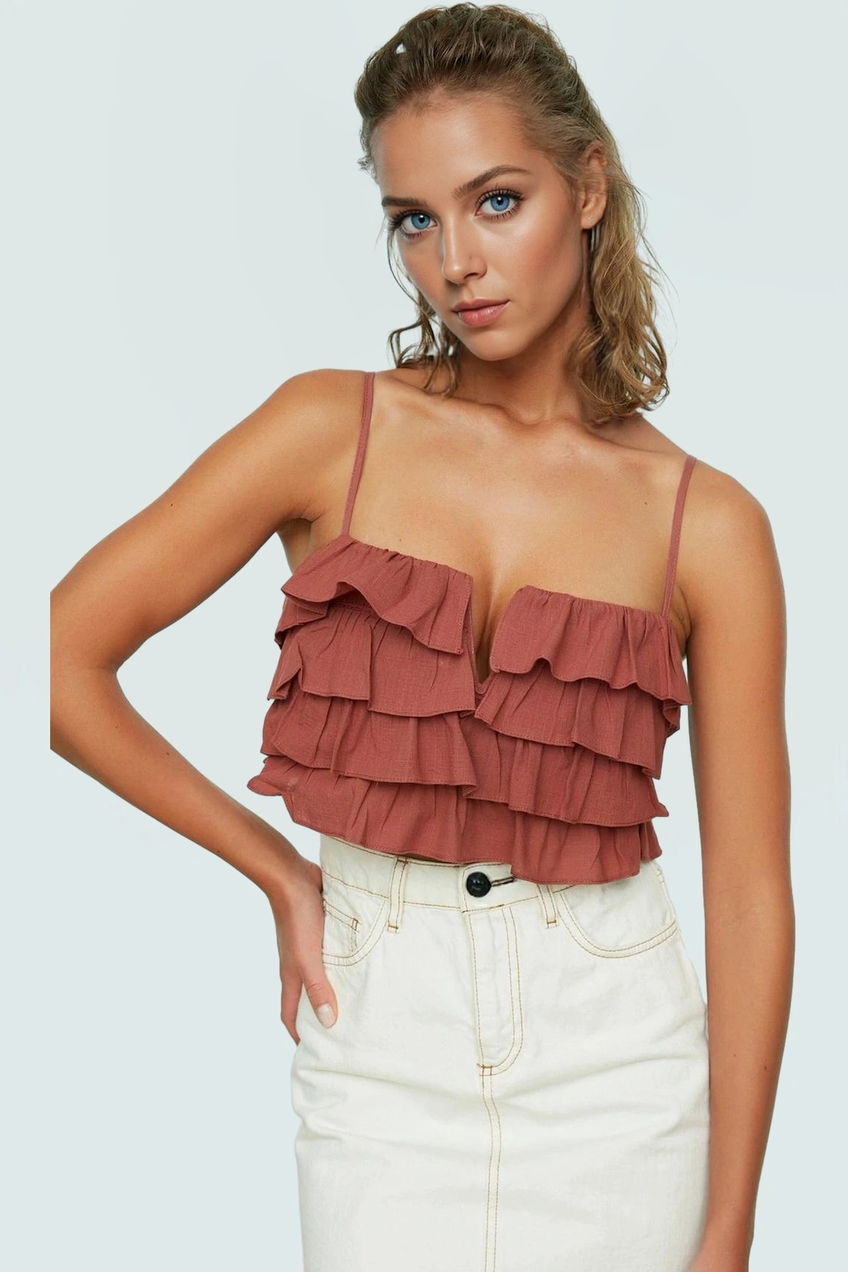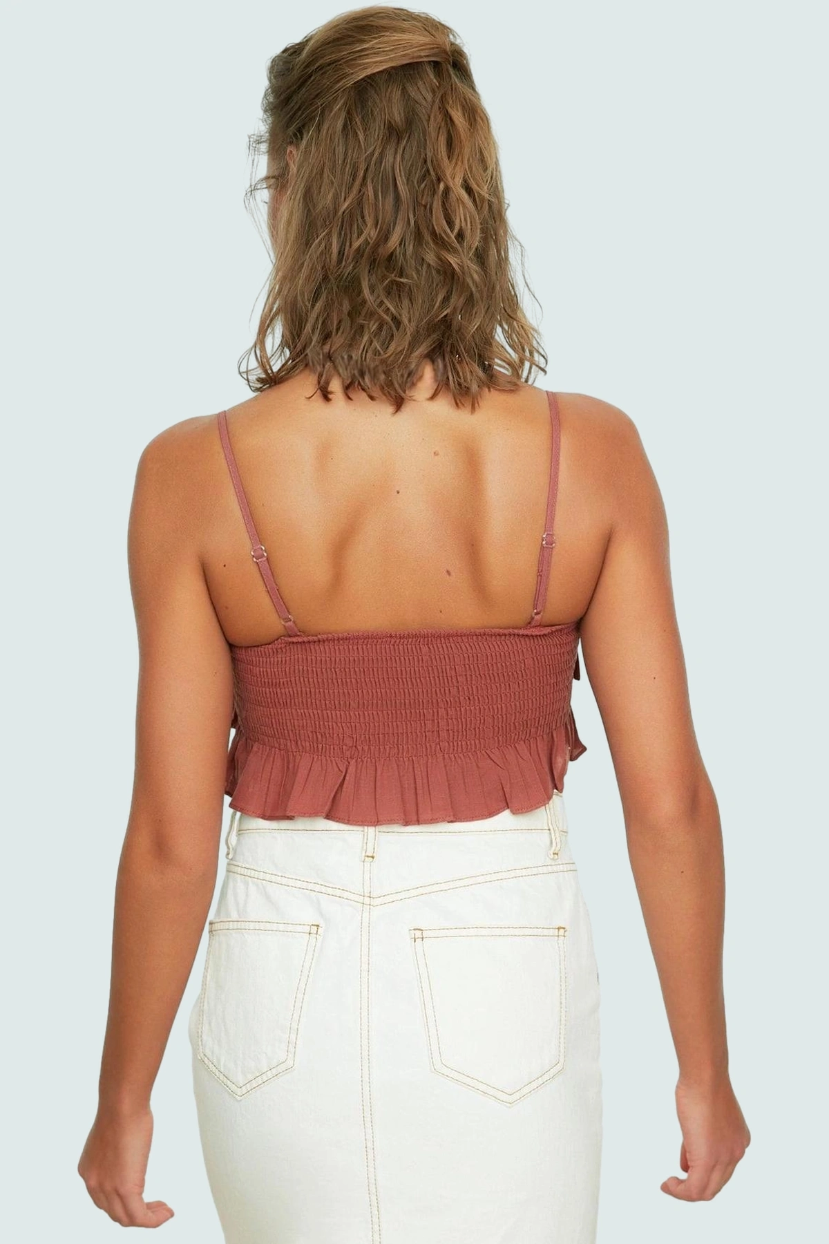 Yazın enerjisini yansıtan bu beyaz crop bluz, plaj ve günlük kombinleriniz için mükemmel bir seçim. 100% pamuklu, dokuma kumaşıyla gün boyu konfor sağlarken, fırfırlı detayı ile şık ve feminen bir görünüm sunuyor. V yaka tasarımı, boyun bölgesini zarifçe sergilerken, kolsuz tasarımı sıcak havalarda serin kalmanıza yardımcı oluyor. Rahat regular kalıbı, çeşitli vücut tiplerine uyum sağlayarak her bedene mükemmel oturuyor.