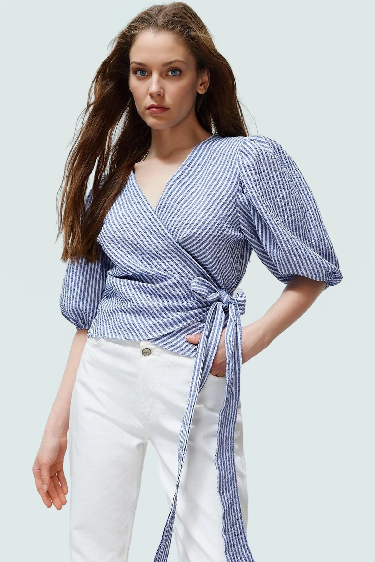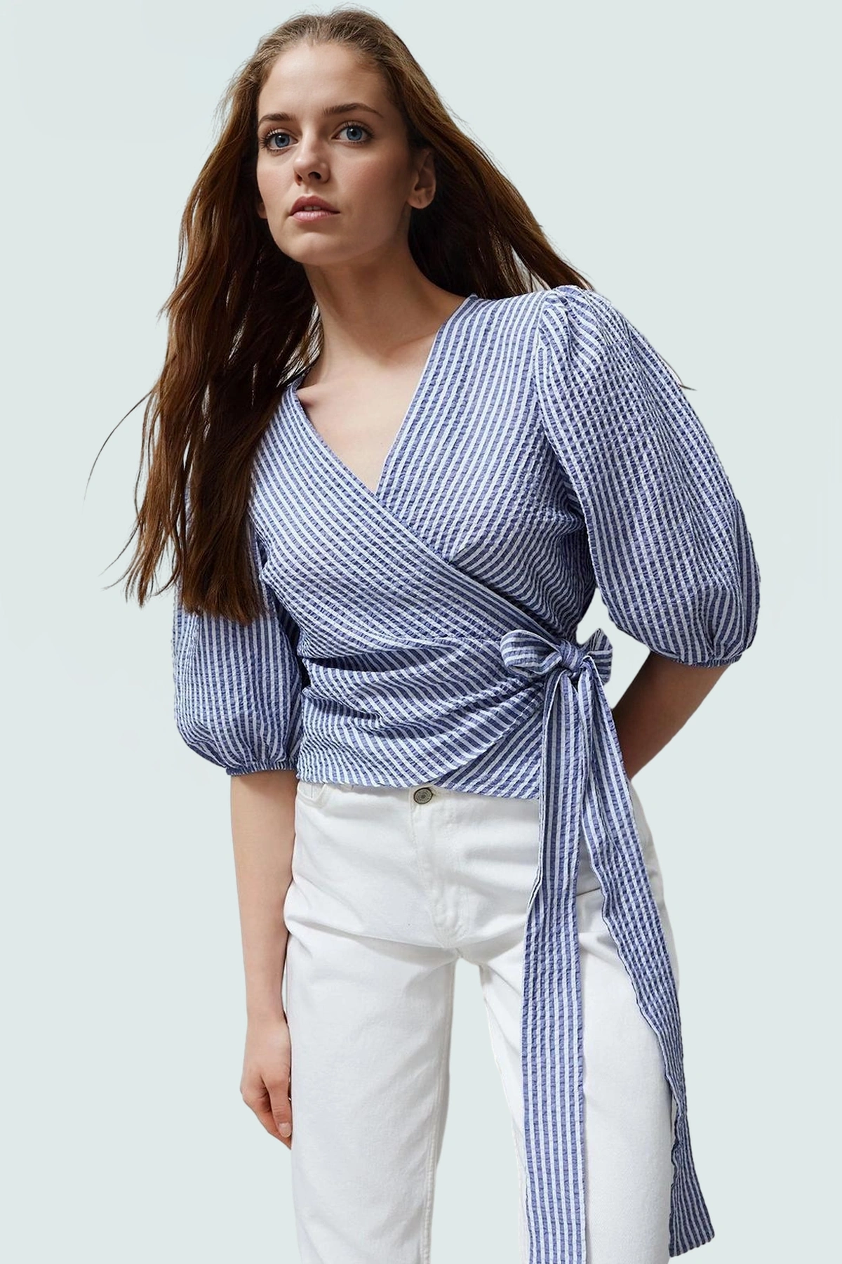 Rahatlığı ve şıklığı bir arada arayanlar için ideal bir bluz! Nefes alan pamuklu kumaştan üretilen bu bluz, V yakası ve balon kollarıyla yaz aylarında serin ve şık kalmanızı sağlar. Çizgili tasarımıyla her türlü kombininize uyum sağlar. Günlük hayatta rahatlıkla kullanabileceğiniz bu bluz, aynı zamanda özel günler için de uygundur. Eteklerle veya şık pantolonlarla kombinleyerek farklı tarzlar yaratabilirsiniz.