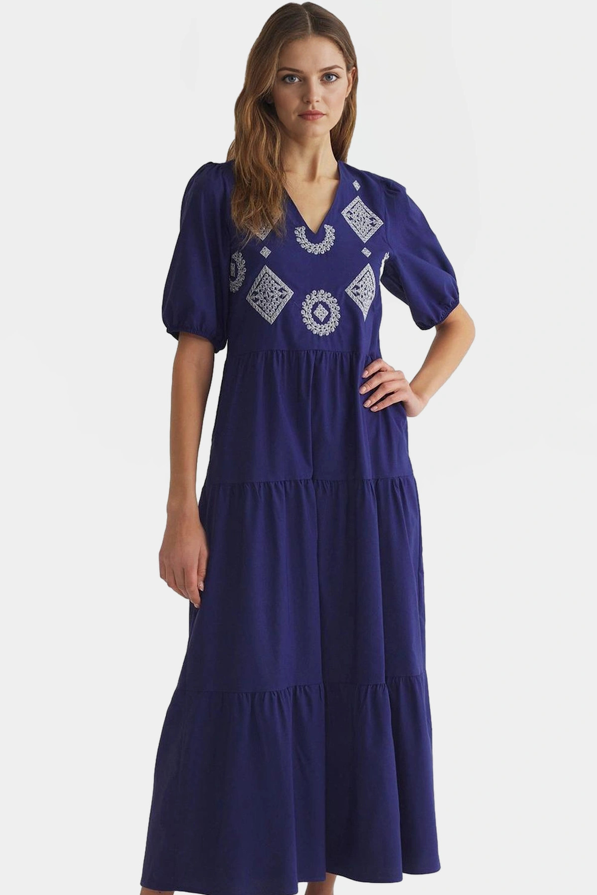 Pamuklu Maxi Elbise Kısa Balon Kol Nakış Detaylı Rahat Kalıp Kullanım Uzun Ömürlü