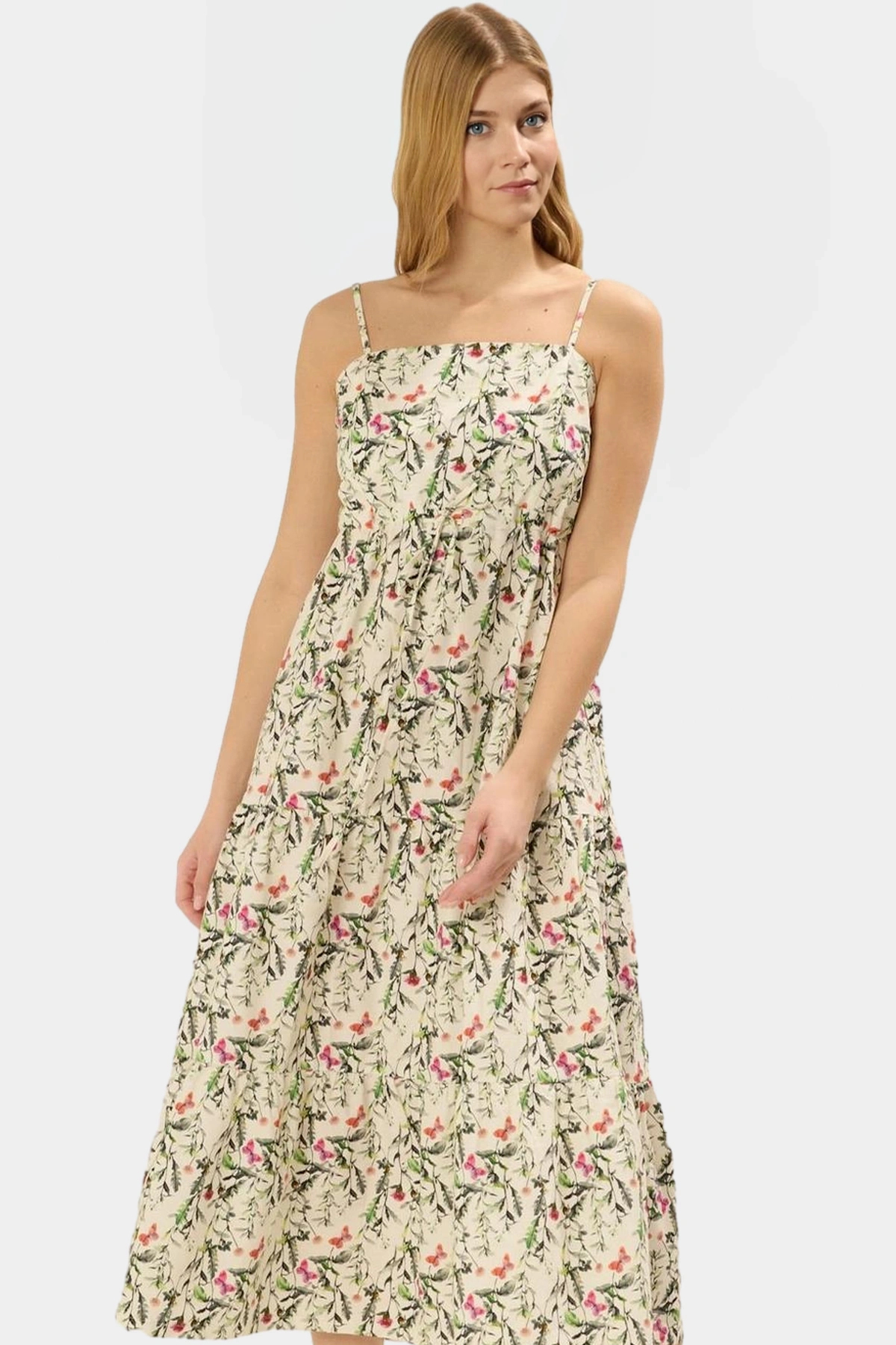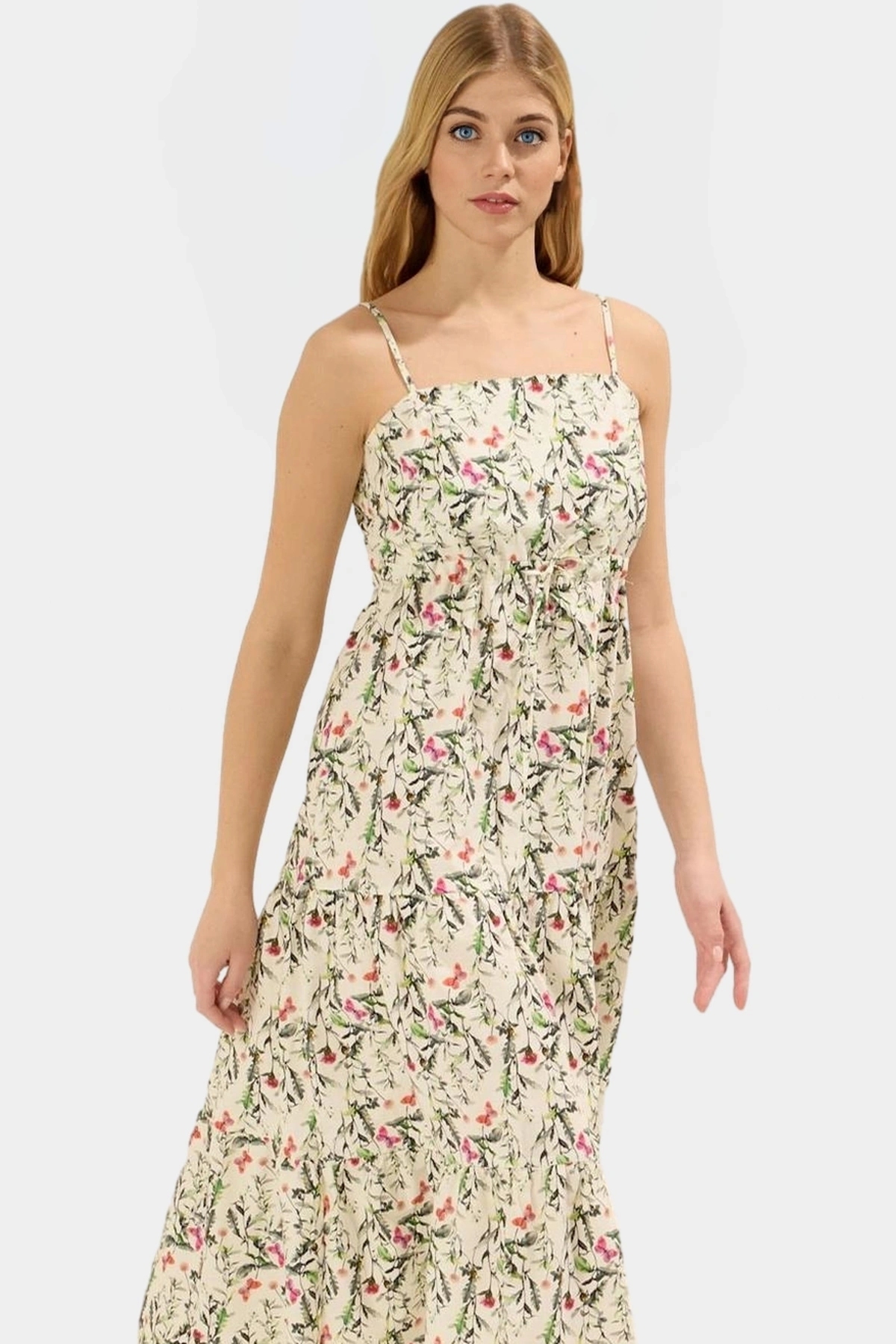 Modelin ölçüleri: Boy: 173 cm, Göğüs: 81 cm, Bel: 61 cm, Kalça: 91 cm. Manken S beden giyiyor. Elbise 36-42 beden aralığında mevcut. Bu çok yönlü elbiseyi, günlük kombinlerinizde rahatlıkla kullanabilirsiniz. Sandaletlerinizle, espadrillerinizle veya düz ayakkabılarla kombinleyerek farklı tarzlar yaratabilirsiniz.