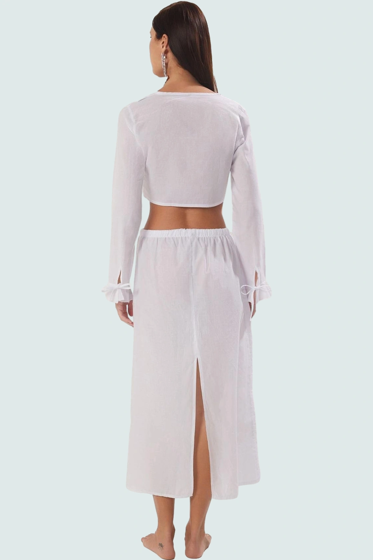 100% pamuktan üretilen takım, yüksek kalite ve dayanıklılık sunuyor. Kolay bakımı sayesinde uzun yıllar boyunca kullanabileceğiniz bir parça olacak. Dik yaka tasarımı ve uzun kolları ile hem şık hem de güneşten korunmayı sağlıyor. Astarsız tasarımıyla hafif ve havadar bir his sunarak, yaz aylarının sıcak günlerinde bile sizi rahat ettirecek. Uzun boylu eteği, plajda veya havuz başında rahat hareket etmenizi sağlayacak.
