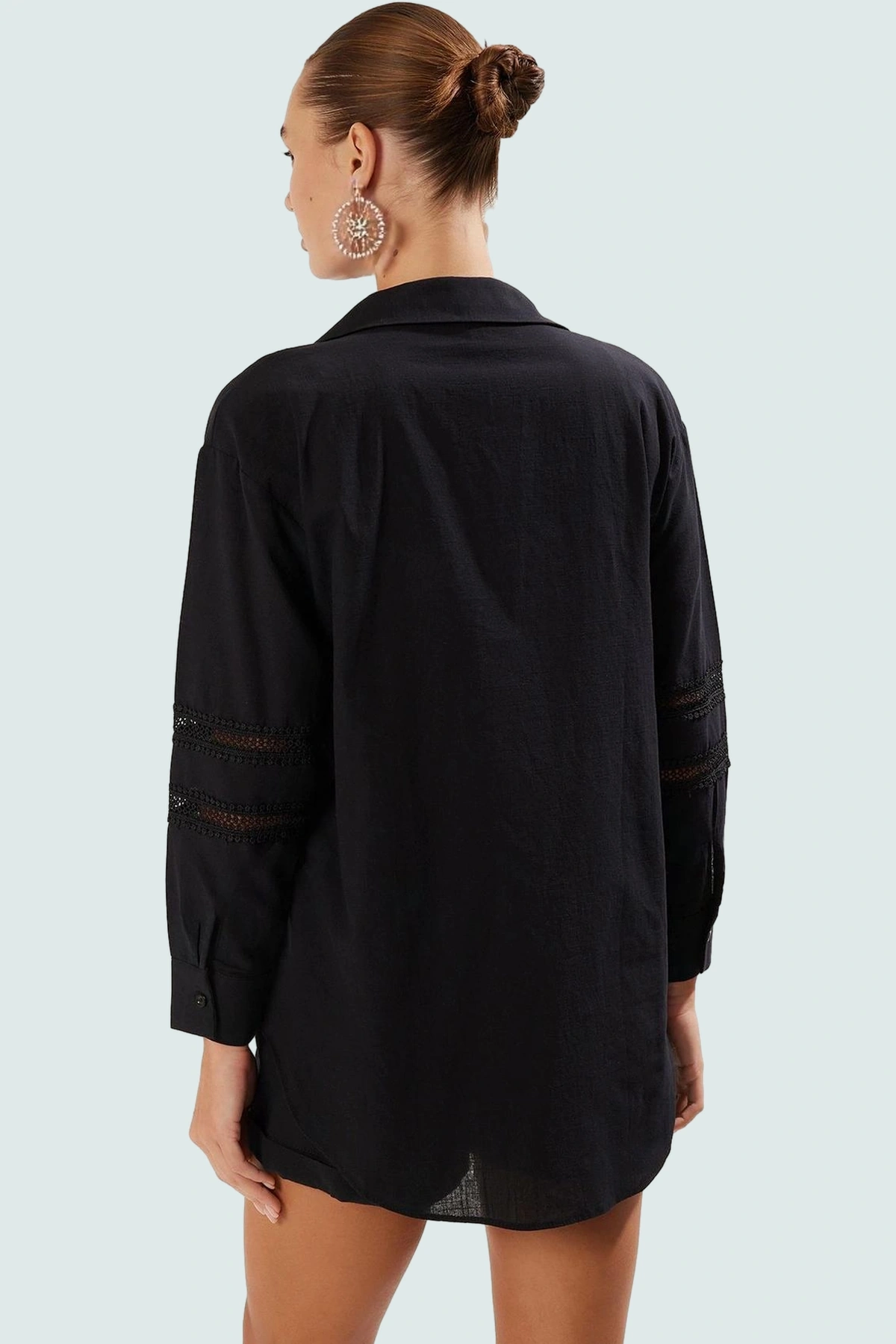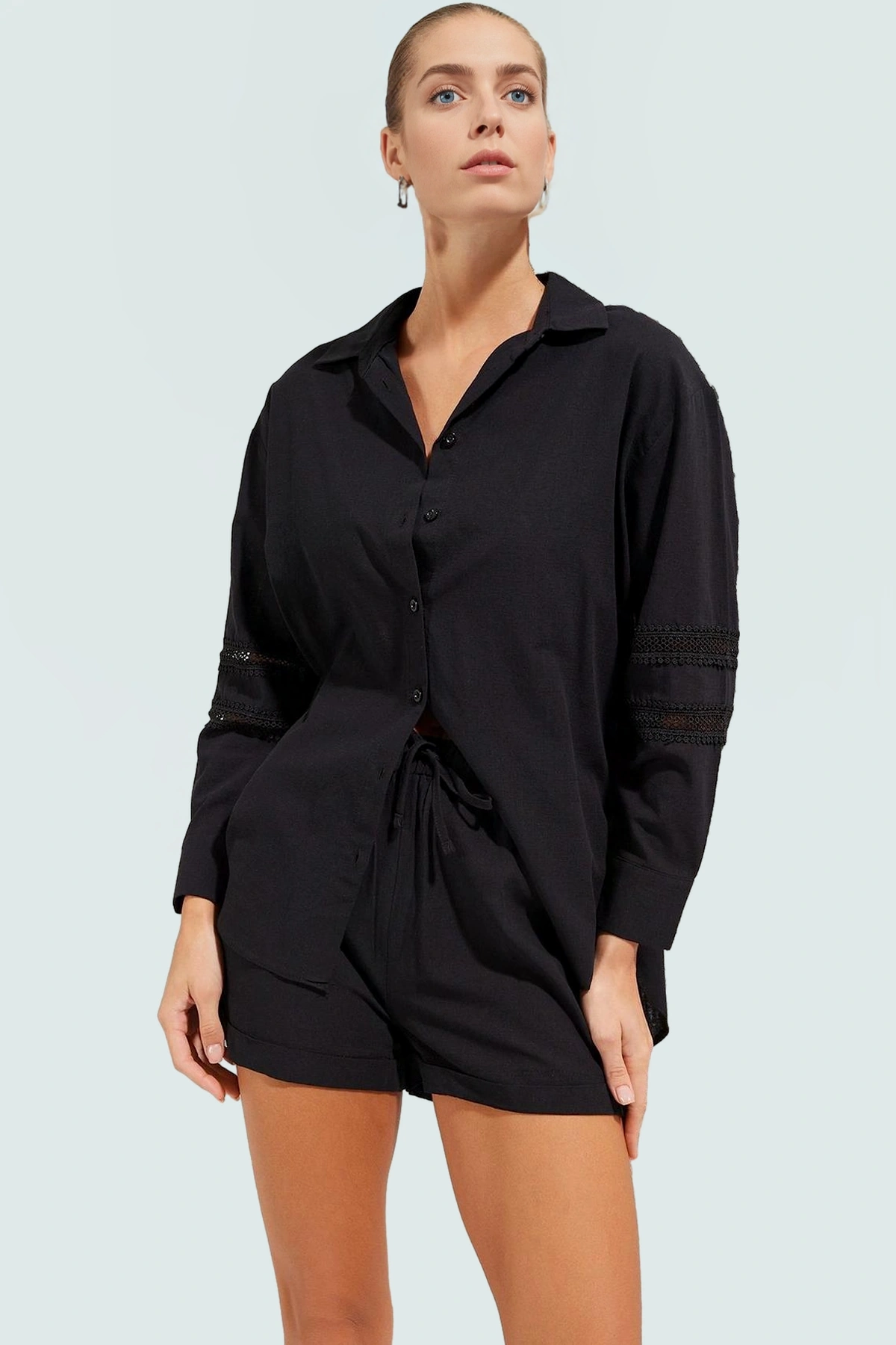 Plaj için şık ve rahat bir takım arıyorsanız, bu siyah pamuklu gömlek ve şort takım tam size göre! %100 pamuktan üretilen bu takım, nefes alan ve yumuşak dokusuyla yaz sıcağında konfor sunuyor. Dokuma kumaşı sayesinde rahat hareket edebilir ve gün boyu kendinizi iyi hissedebilirsiniz. Kısa şort ve rahat kesimiyle plajda, havuz başında veya günlük yaşamda rahatça kullanabilirsiniz. Gömleğin şık gömlek yakası ve uzun kollarıyla, şıklığınızdan ödün vermeden rahatlığı yakalayabilirsiniz.