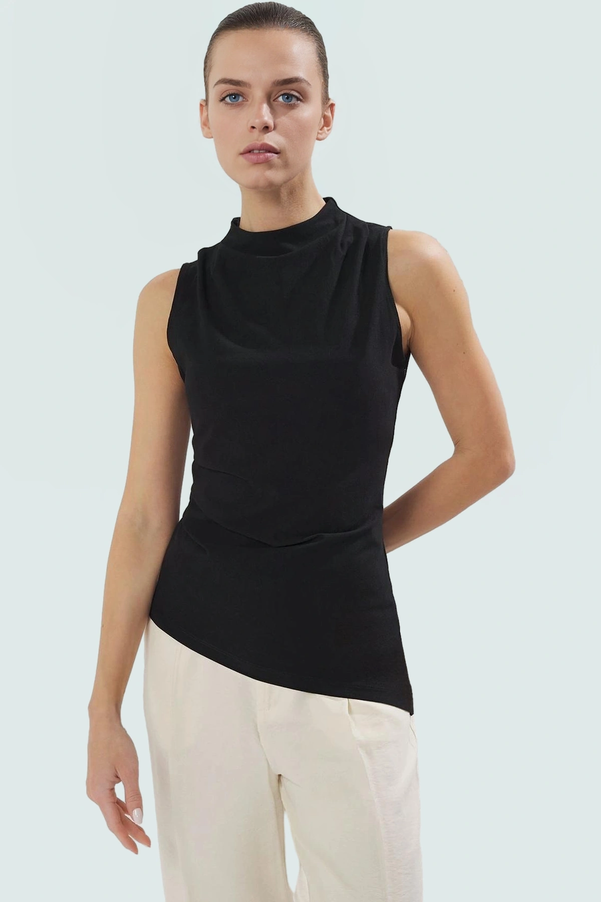 Paper Touch Örme Bluz Renk Asimetrik Kesim Dik Yaka Rahat Kullanım Seçkin Malzeme