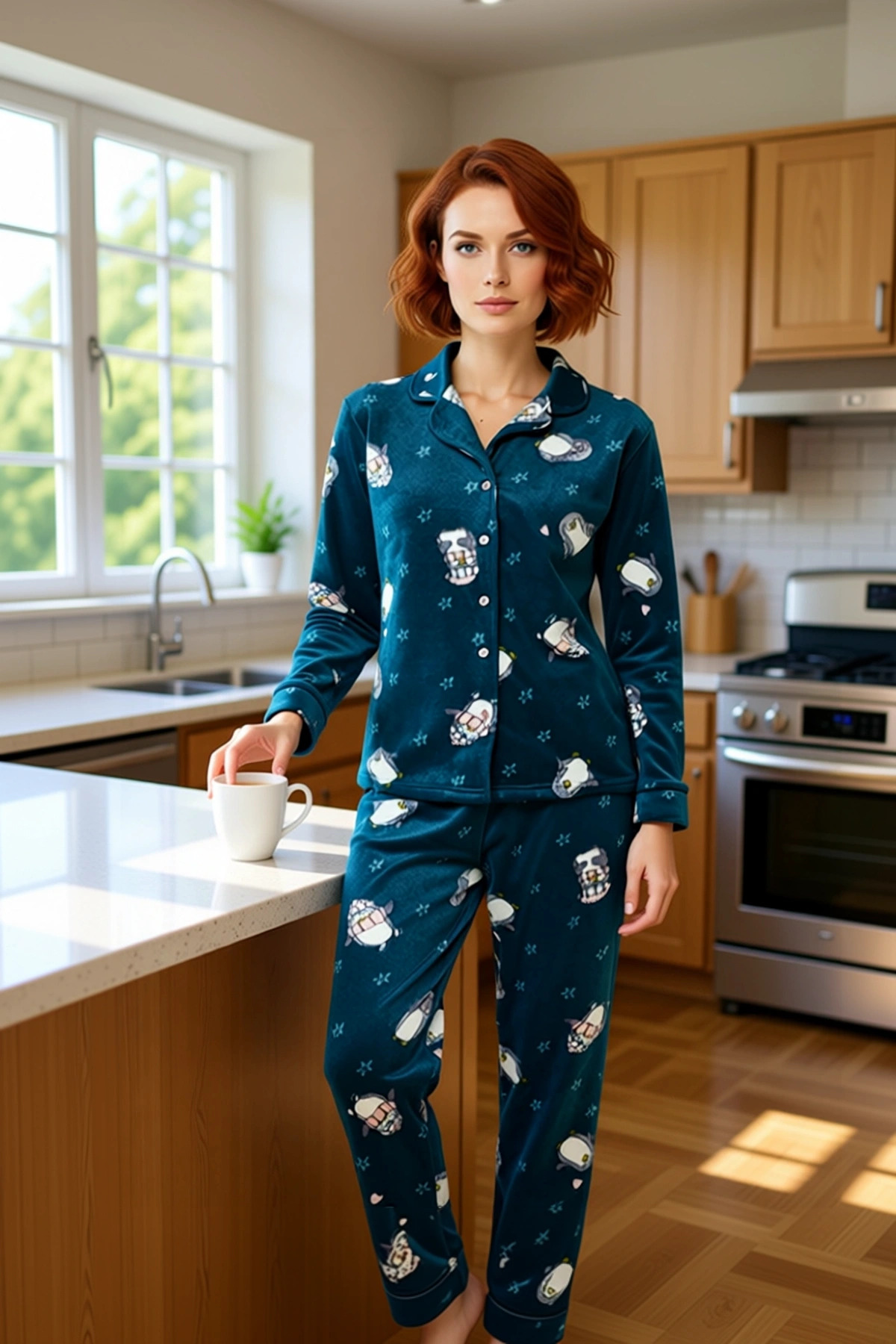 Petrol Penguen Desenli Polar Kadın Pijama Takımı Fonksiyonel Dayanıklı Kaliteli Konforlu Şık