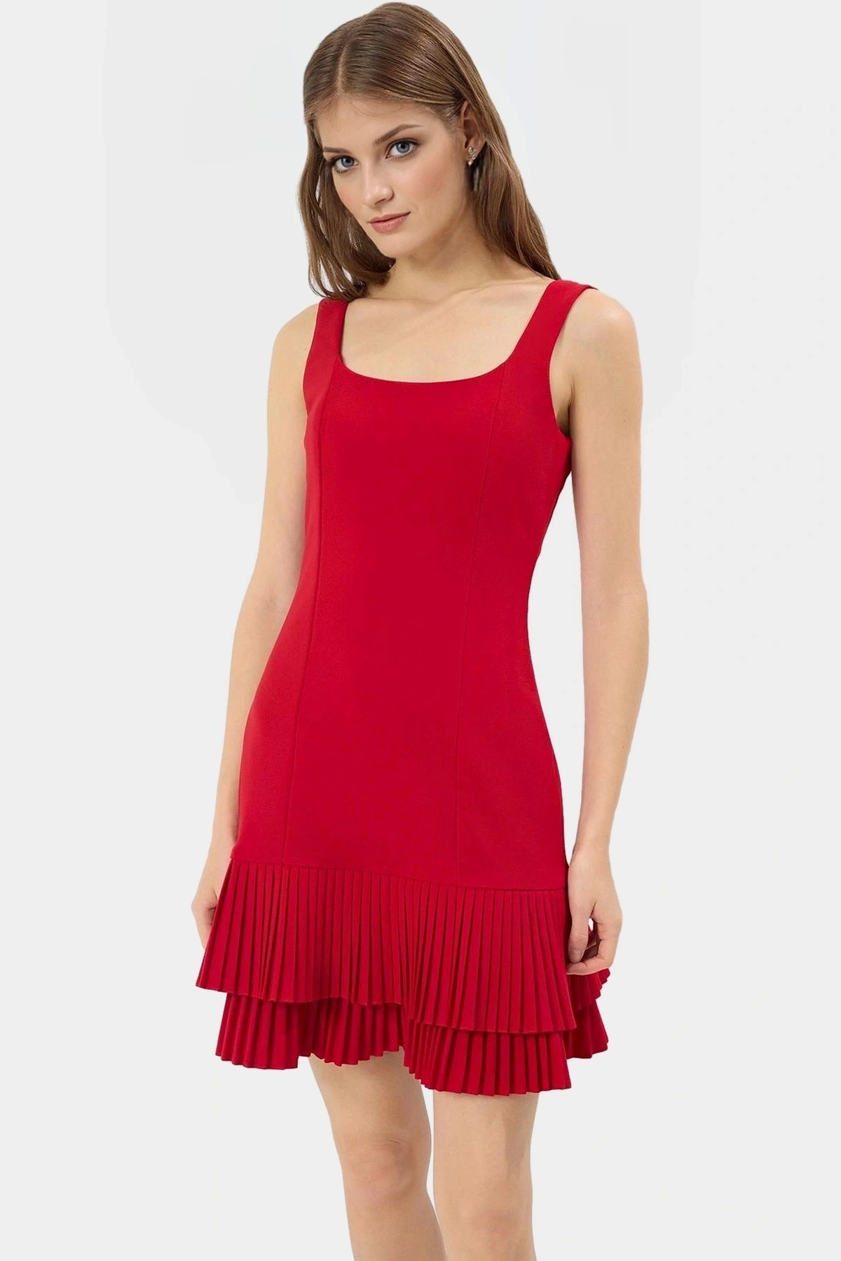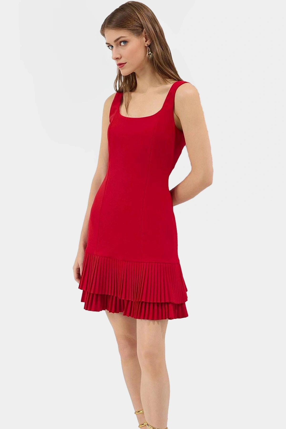 Bu göz alıcı kırmızı elbise, yaz aylarında tarzınızı yansıtmanın mükemmel bir yolu. Dokuma kumaştan üretilen elbise, şık piliseli detayıyla dikkat çekiyor. Kolsuz tasarımı ve rahat kesimiyle sıcak günlerde serin kalmanıza yardımcı olurken, mini boyu ve skater kalıbıyla da her ortama uyum sağlıyor.