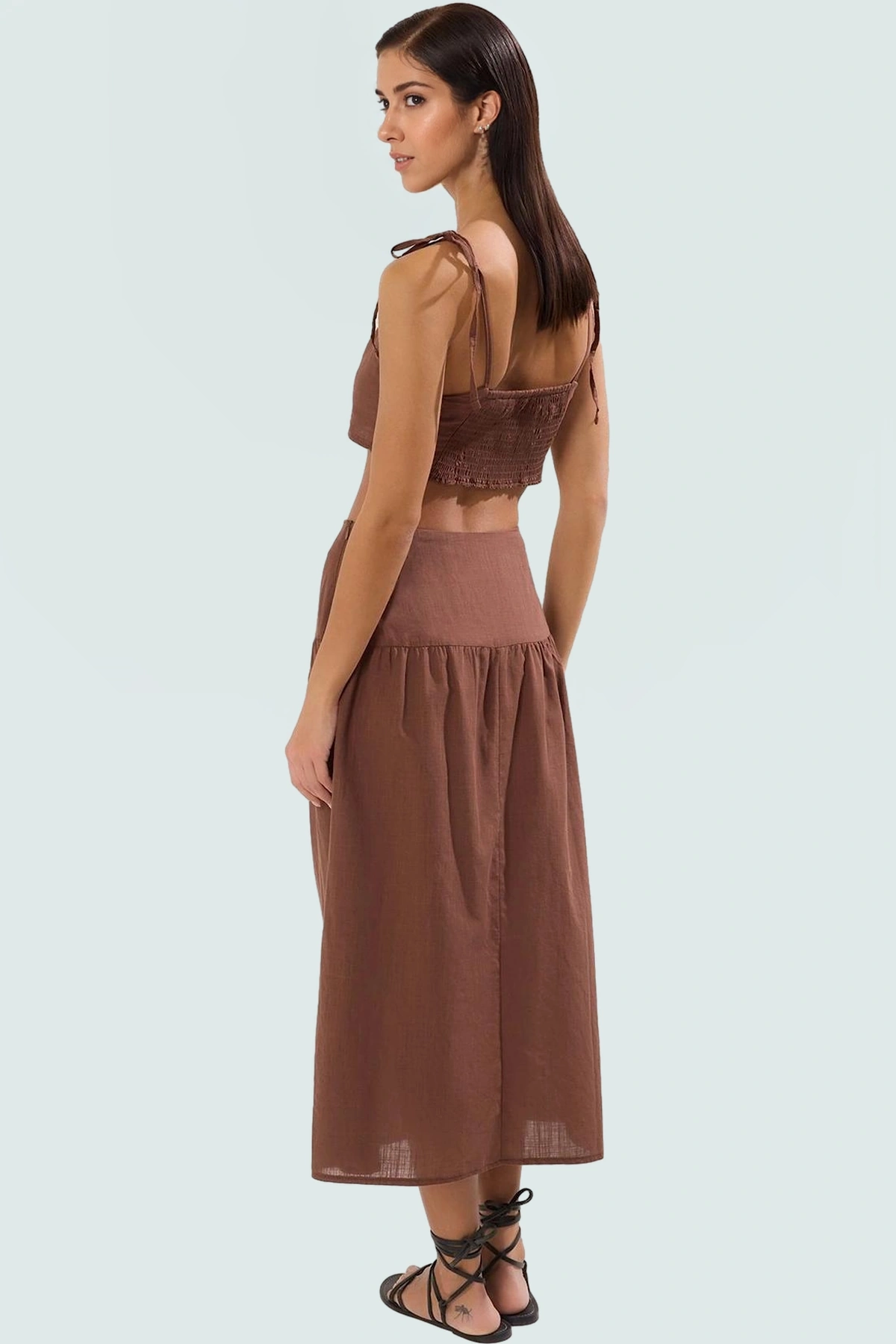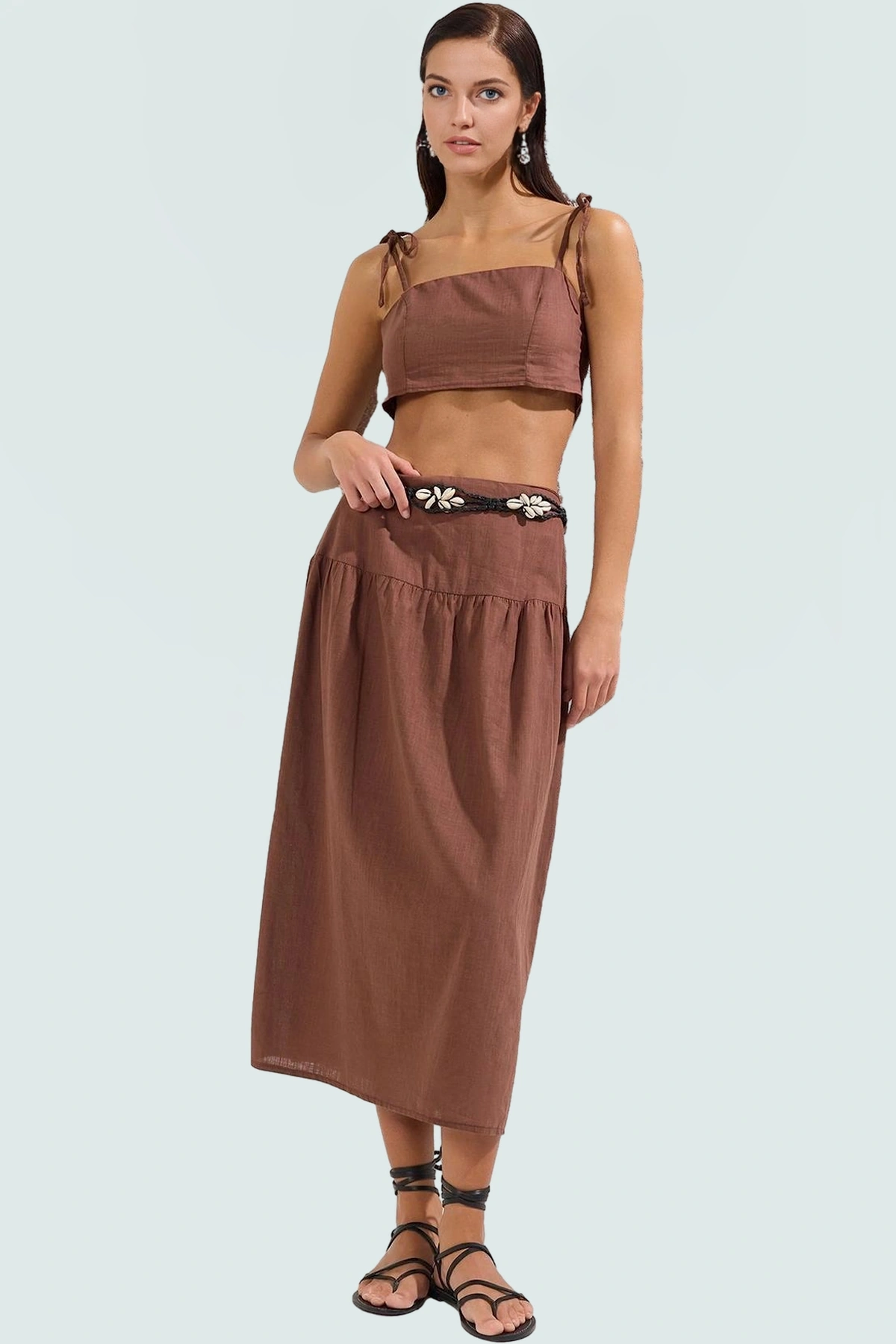 Yazın vazgeçilmezi olacak bu plaj takımı ile rahatlığı ve şıklığı bir arada yaşayın! Kahverengi rengi ve düz deseniyle her zaman şık görünmenizi sağlar. 75% pamuk, 25% elastan karışımı kumaş, nefes alabilir ve yumuşak yapısıyla gün boyu konfor sunar. Flamlı pamuk dokuma özelliğiyle de uzun süreli kullanım sağlar. Crop bluz ve rahat eteğiyle plajda, havuz başında veya günlük hayatta rahat hareket edebilirsiniz.