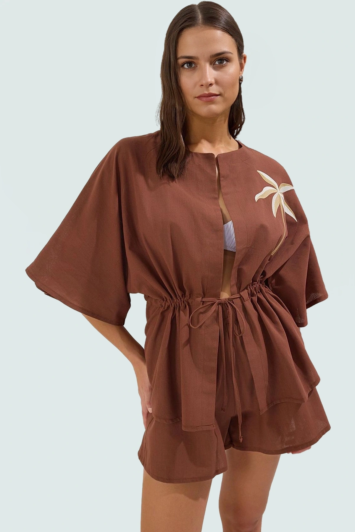 Bu yaz, plaj günlerinizi rahat ve şık bir şekilde geçirmek için mükemmel bir seçim olan kahverengi pamuklu bluz şort takımımızla tanışın. %100 pamuk dokuma kumaştan üretilen bu takım, yaz sıcağında nefes alabilirliği ve yumuşak dokusuyla sizi serin tutar. Dik yakası ve truvakar kolları ile şık bir görünüm sunarken, rahat kesimiyle gün boyu konfor sağlar. Plajda, havuz başında veya günlük yaşamda rahatlıkla kullanabileceğiniz bu takım, tarzınıza ve rahatlığınıza odaklanmıştır.
