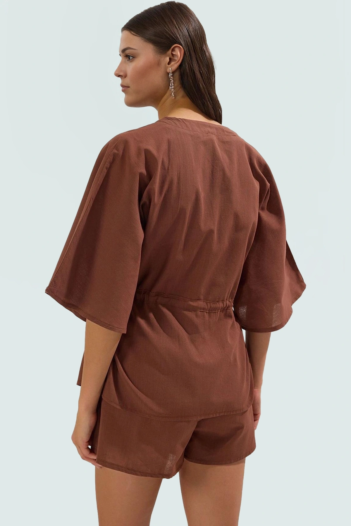 Plaj İçin Pamuklu Bluz Şort Takımı Rahat Kesim Dik Yaka Truvakar Kol Mükemmel Uyum - Görsel 4