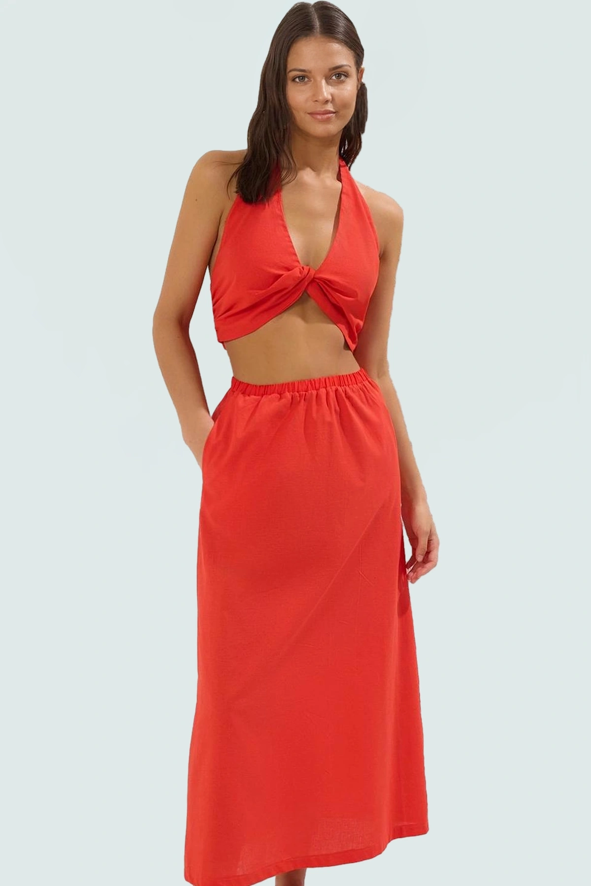 Sizi yazın sıcak günlerinde serin ve şık tutacak bu kırmızı bluz etek takımı, plaj modasına yeni bir soluk getiriyor. %100 pamuk kumaştan üretilen takımın flamlı dokuma yapısı, hafif ve nefes alabilir bir his sunuyor. V yakalı bluz ve uzun etek, şıklığı ve rahatlığı bir araya getiriyor.