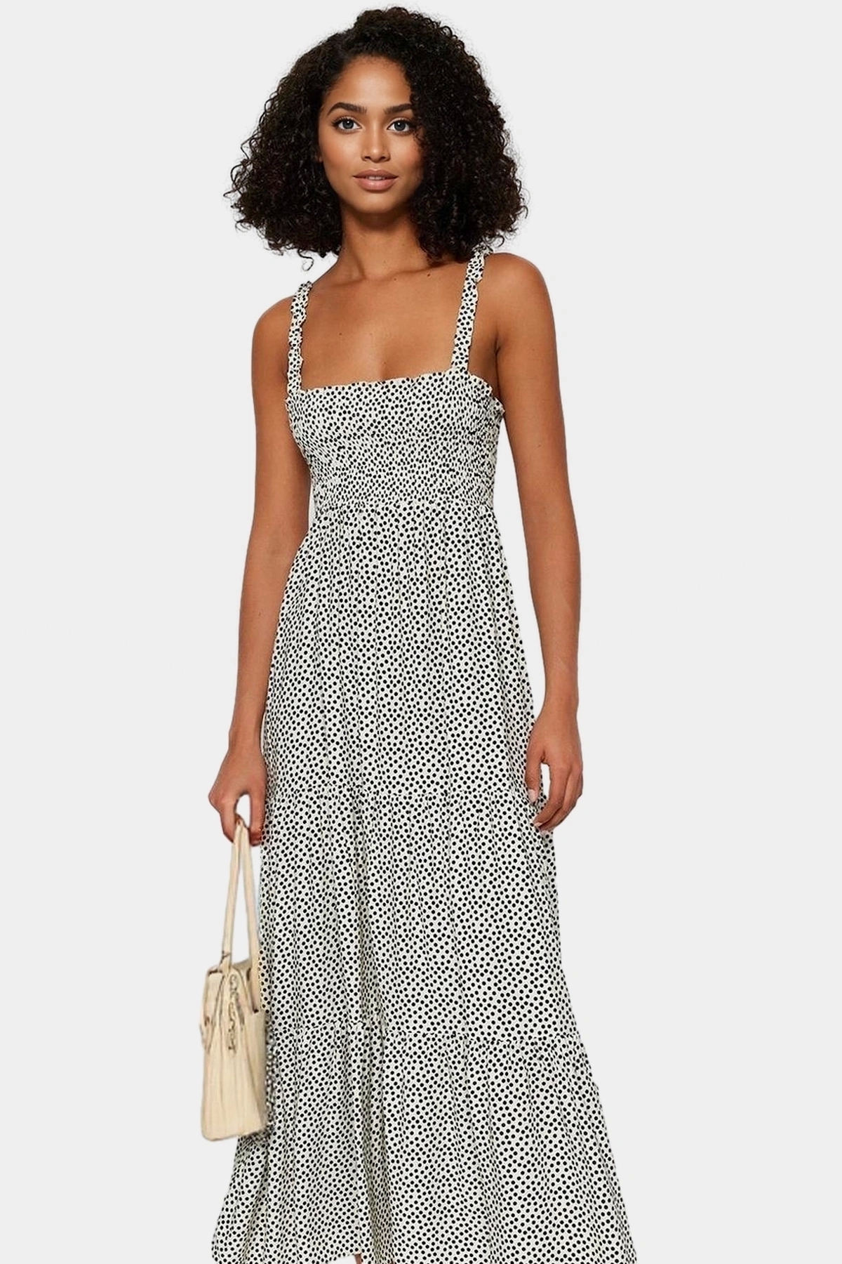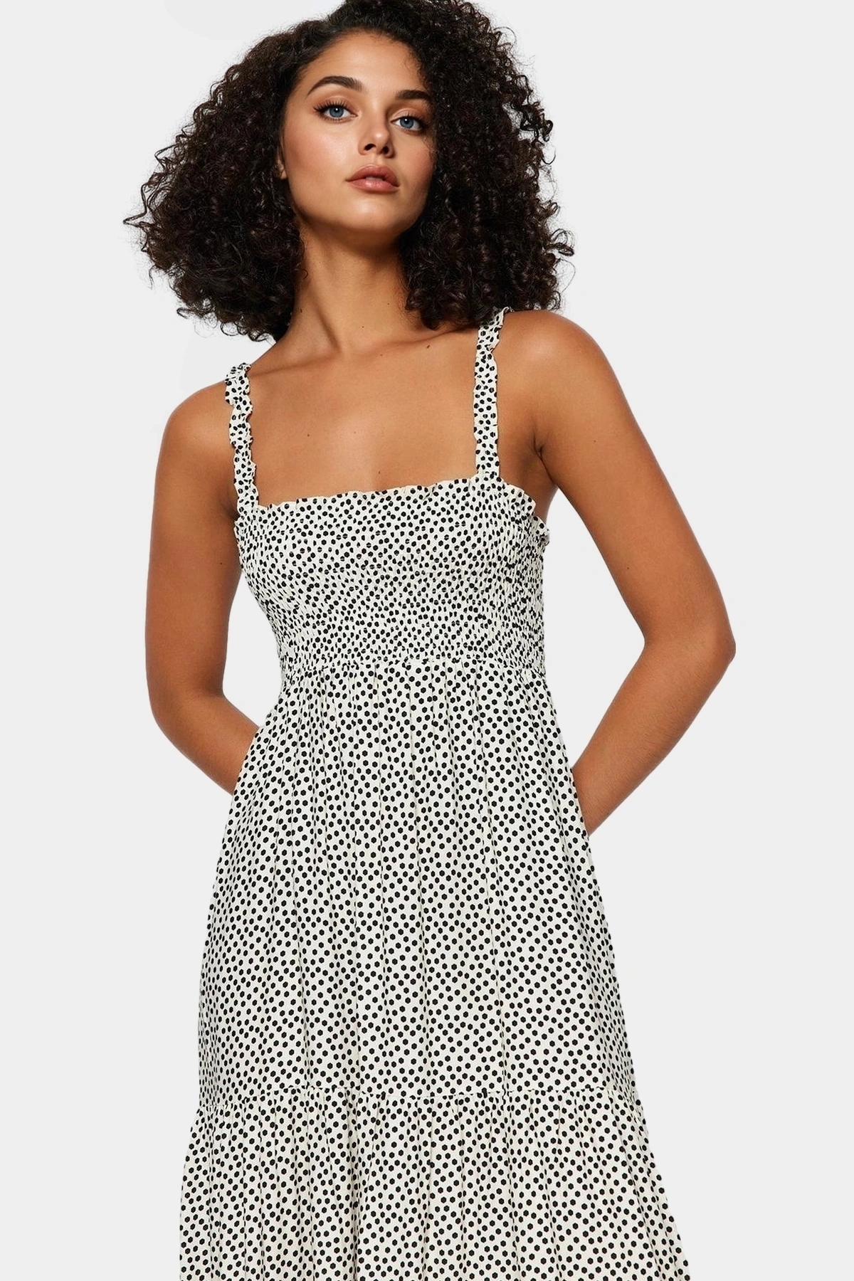 Şıklığı ve rahatlığı bir arada arayanlar için mükemmel bir seçenek olan bu beyaz puantiyeli midi elbise, yaz aylarının vazgeçilmezi olacak. 100% viskoz kumaştan üretilen elbise, nefes alabilir yapısıyla gün boyu konfor sunuyor. Kare yakası ve gipeli detaylarıyla göz alıcı bir görünüme sahip olan elbise, rahat kalıbıyla da hareket özgürlüğü sağlıyor. Hem günlük hem de özel günler için uygun olan bu elbise, farklı kombinlerle her ortama uyum sağlıyor.