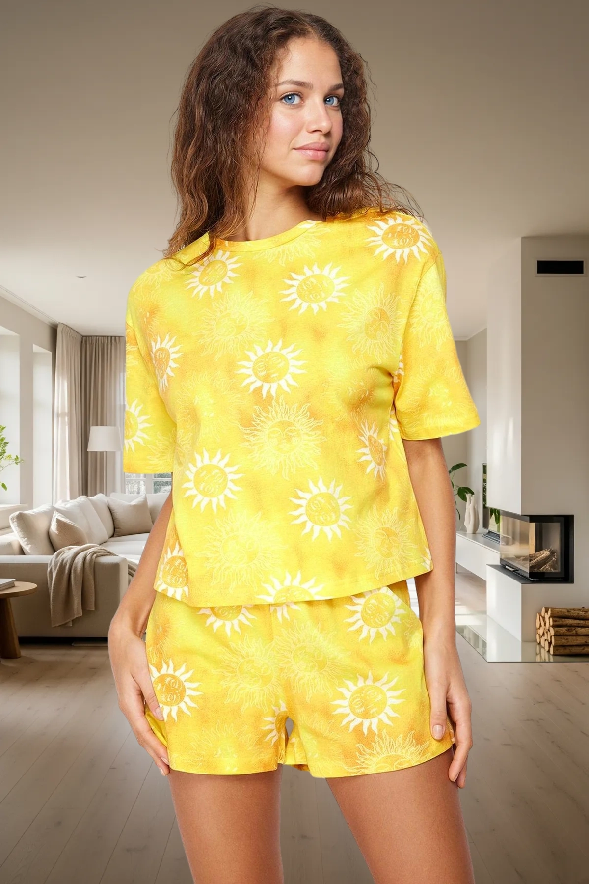 Yumuşak, nefes alan %100 pamuklu kumaştan üretilen bu pijama takımı, yaz aylarında rahatlığın keyfini çıkarmanızı sağlar. Güneş desenleriyle süslenmiş şık tasarımıyla, evde dinlenirken bile stil sahibi olabilirsiniz. Kısa kollu tişört ve şorttan oluşan takım, her vücut tipine uyum sağlayan normal kalıba sahiptir. Günlük kullanım için ideal olan bu pijama takımı, makinede yıkanabilir özelliğiyle pratikliği de beraberinde getirir. Yaz gecelerinde huzurlu ve konforlu bir uyku için mükemmel bir seçimdir. Hem rahatlığı hem de şıklığı bir arada sunan bu pijama takımı ile evinizde kendinizi özel hissedin. Nefes alabilir yapısıyla sıcak havalarda serin kalmanıza yardımcı olurken, yumuşak dokusuyla cildinize mükemmel bir his verir. Bu yaz, rahatlığınızdan ödün vermeden şıklığınızı sergileyin.