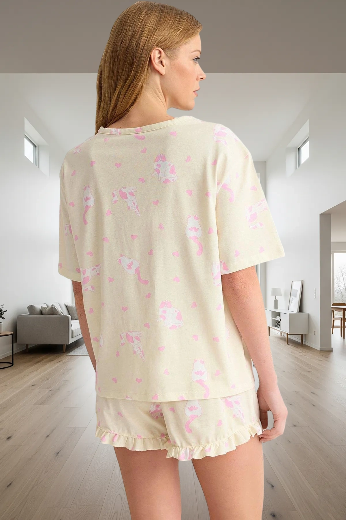 Pamuk kumaşın yumuşak dokusu ve nefes alabilir özelliği, teninize değdiğinde sizi saracak. Fırfırlı şortun şık ve feminen detayı, evde de şıklıktan ödün vermenizi engelleyecek. Sevimli kedi ve kalp desenleri ile pijama takımınız her zaman neşeli bir hava katacak. Regular kalıp ise rahatlığıyla sizi etkileyecek. 30/1 Openend dokuma tipi sayesinde uzun süreli kullanım için dayanıklı bir yapıya sahip olan bu pijama takımını gönül rahatlığıyla tercih edebilirsiniz.