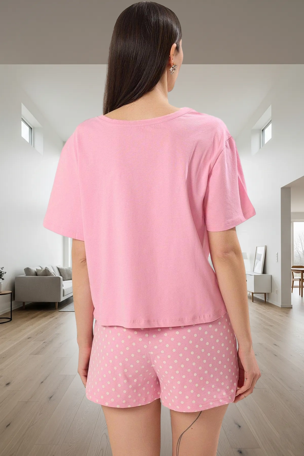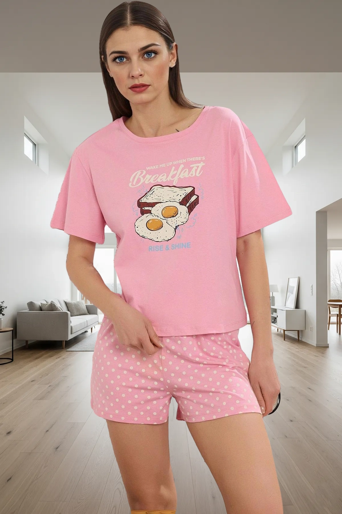 Evinizin rahatlığında kendinizi şımartın! %100 pamuklu, yumuşak dokusuyla bu pijama takımı, gün boyu süren konforu garanti eder. Pembe puantiyeli deseni ve eğlenceli kahvaltı baskısıyla, şıklığı ve rahatlığı bir arada sunar. Kısa kollu tişört ve şorttan oluşan bu takım, yaz aylarında serin ve rahat kalmanıza yardımcı olur.