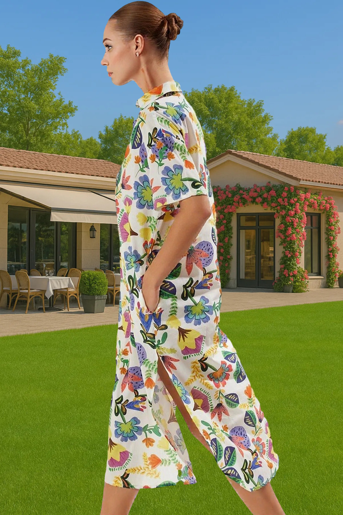 Sıcak yaz günlerinde kendinizi rahat ve şık hissetmenizi sağlayacak bu midi elbise, %100 pamuklu yapısıyla nefes alabilir ve yumuşaktır. Çiçek desenleri ve tek kollu tasarımıyla tarzınızı yansıtırken, rahatlığıyla da sizi etkileyecektir. Yırtmaç detayı hareket kabiliyetinizi artırırken, midi boyu her ortama uyum sağlar.