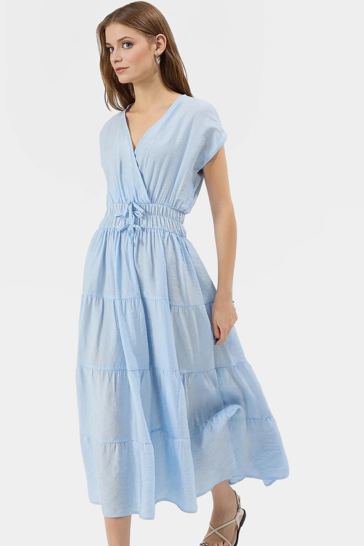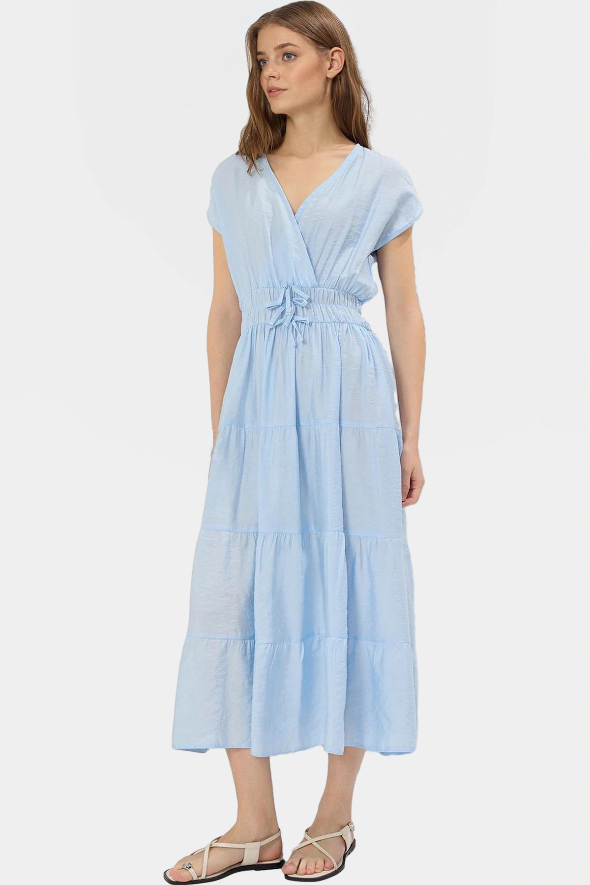 Bu nefes alan, rahat mavi elbise, günlük yaşamınız için mükemmel bir seçim. 86% viskoz ve 14% poliamid karışımı, yumuşak ve hafif bir his sunarken, Lilyum dokuma tipi ise şık bir görünüm sağlar. A-line kalıbı, her vücut tipine uyum sağlayarak rahat bir kullanım sunar. Kısa kollu, V yakalı ve fiyonk detaylı tasarımı ile hem şık hem de kullanışlı. Elbisenin yüksek kaliteli kumaşı, dayanıklılığının yanı sıra kolay bakımıyla da öne çıkar. Astarsız yapısıyla yaz aylarında serin kalmanıza yardımcı olur. 130 cm boyuyla, farklı kombin seçeneklerine imkan tanır. Modelin ölçüleri (Boy: 174cm, Göğüs: 78cm, Bel: 58cm, Kalça: 87cm) ve mankenin 36 beden giymesiyle ilgili bilgi size beden seçimi konusunda yardımcı olacaktır. Elbisenizi düz renk sandaletler ve minimal bir çantayla kombinleyebilirsiniz.