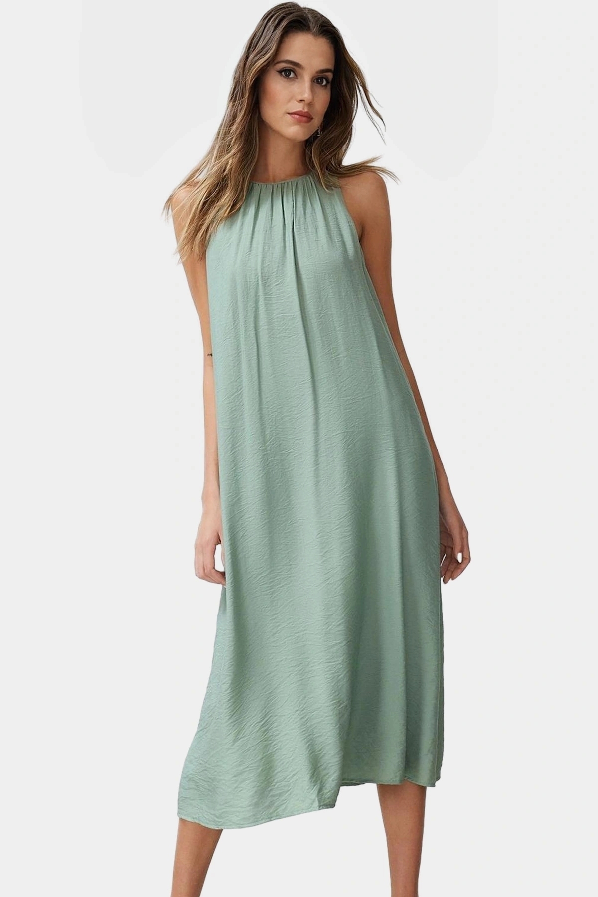 Yüksek kaliteli Aerobin dokuması sayesinde nefes alabilen ve hafif bir yapıya sahiptir. Elbisenin rahatlığı, gün boyu süren konfor sağlar. Düz kesim detayları, modern ve şık bir görünüm sunar. Halter yakası, kadınsı ve zarif bir tarz yaratır. Kolay kombinlenebilen elbise, farklı aksesuarlarla tamamlanarak çeşitli stillerde kullanılabilir.