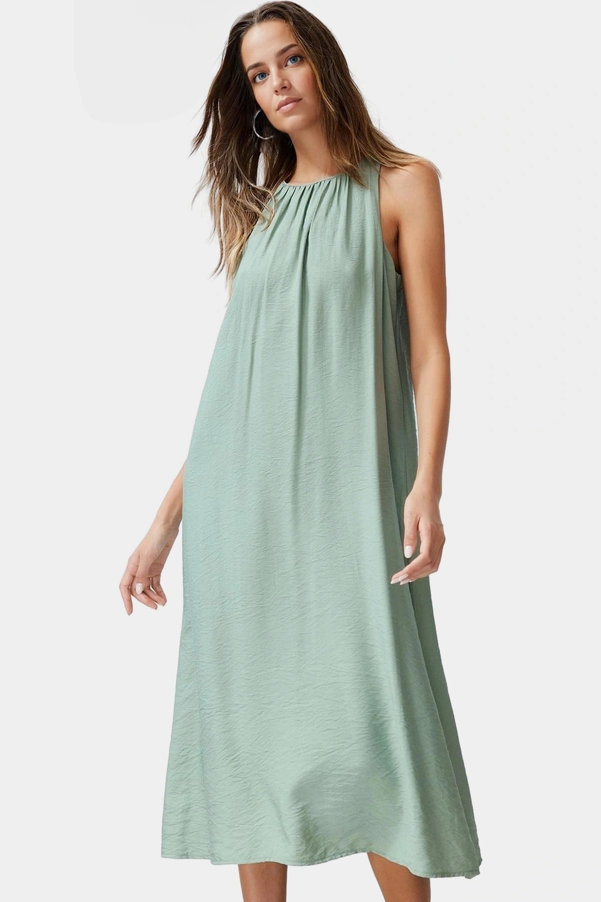 Bu rahat ve şık elbise, günlük yaşamınızda konfor ve stil arayanlar için mükemmel bir seçim. Aerobin dokuma kumaştan üretilen elbise, nefes alabilir yapısıyla yaz aylarında serin kalmanıza yardımcı olur. Haki rengi ve düz kesimiyle her ortama uyum sağlar. Midi boyu ve geniş kesimi sayesinde rahat hareket edebilir ve gün boyu kendinizi iyi hissedebilirsiniz. Halter yakası ise feminen bir dokunuş katmaktadır. Düz tasarımı ve rahat kalıbıyla mükemmel bir yazlık elbise.
