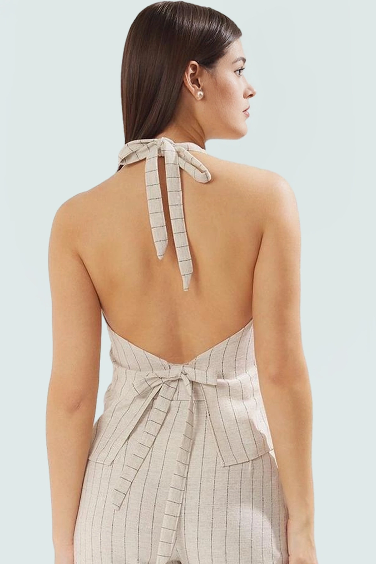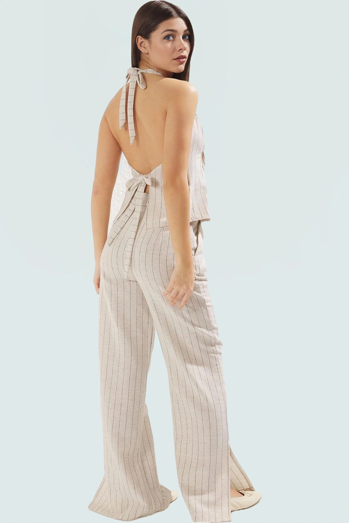 39% viskoz, 31% pamuk, 24% polyester ve 6% akrilik karışımı olan kumaş, dayanıklı ve uzun ömürlüdür. Yeleğin halter yakası ve pantolonun geniş paçası, modern ve rahat bir tarz oluşturur. Crop uzunluğundaki yelek ve geniş paça pantolon, farklı vücut tiplerine uyum sağlar ve her kombininize şık bir dokunuş katar. Kolay bakım gerektiren kumaş yapısı sayesinde, makinede yıkayabilirsiniz.