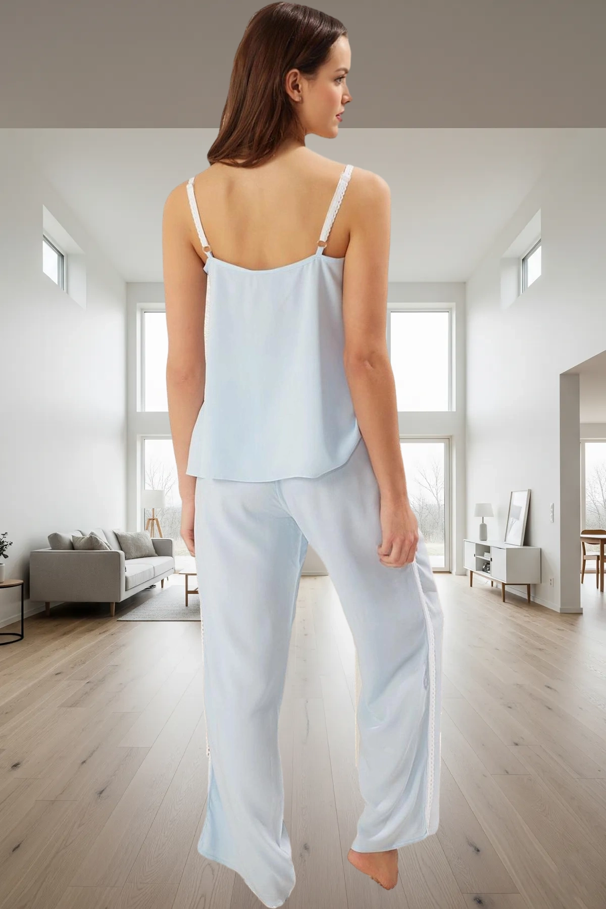 Ev konforunu bir üst seviyeye taşıyacak bu 2’li pijama takımı, yumuşak dokusu ve şık tasarımıyla dikkatleri üzerine çekiyor. %100 Viskoz poplin kumaştan üretilen takım, nefes alabilir özelliğiyle gün boyu rahatlık sunuyor. İnce askılı ve V yaka tasarımıyla feminen bir görünüm sergilerken, regular kalıp vücut hatlarınıza kusursuz uyum sağlıyor. Normal bel ve boru paça detayları ise konforlu bir kullanım deneyimi sunuyor. Mavi rengi ve şık danteliyle evde geçirdiğiniz zamanı daha keyifli hale getirmek için tasarlandı. İlkbahar ve sonbahar aylarında ideal olan bu pijama takımı, T52 yıkama talimatına uygun olarak kolayca temizlenebilir.